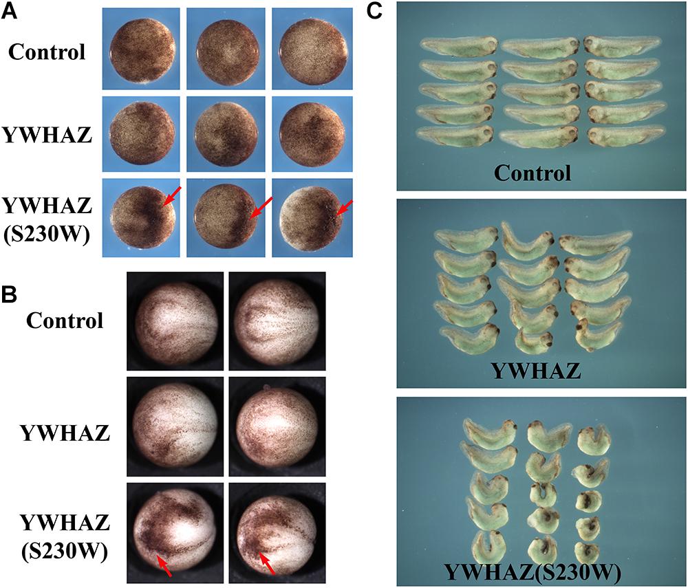 Cardiofaciocutaneous (CFC) syndrome is a genetic disorder characterized by distinctive facial features, congenital heart defects, and skin abnormalities. Several germline gain-of-function mutations in the RAS/RAF/MEK/ERK pathway are associated with the disease, including KRAS, BRAF, MEK1, and MEK2. CFC syndrome thus belongs to a group of disorders known as RASopathies, which are all caused by pathogenic mutations in various genes encoding components of the RAS pathway. We recently identified novel variants in YWHAZ, a 14-3-3 family member, in individuals with a phenotype consistent with CFC that may potentially be deleterious and disease-causing. In the current study, we take advantage of the vertebrate model Xenopus laevis to analyze the functional consequence of a particular YWHAZ variant, S230W, and investigate the molecular mechanisms underlying its activity. We show that compared with wild type YWHAZ, the S230W variant induces severe embryonic defects when ectopically expressed in early Xenopus embryos. The S230W variant also rescues the defects induced by a dominant negative FGF receptor more efficiently and enhances Raf-stimulated Erk phosphorylation to a higher level than wild type YWHAZ. Although neither YWHAZ nor the variant promotes membrane recruitment of Raf proteins, the variant binds to more Raf and escapes phosphorylation by casein kinase 1a. Our data provide strong support to the hypothesis that the S230W variant of YWHAZ is a gain-of-function mutation in the RAS-ERK pathway and may underlie a CFC phenotype.
