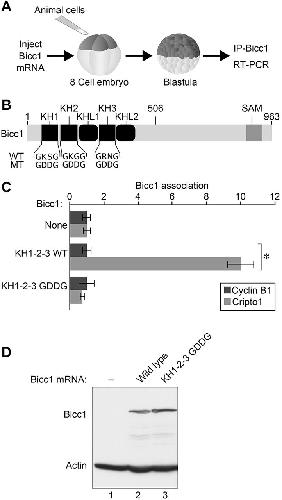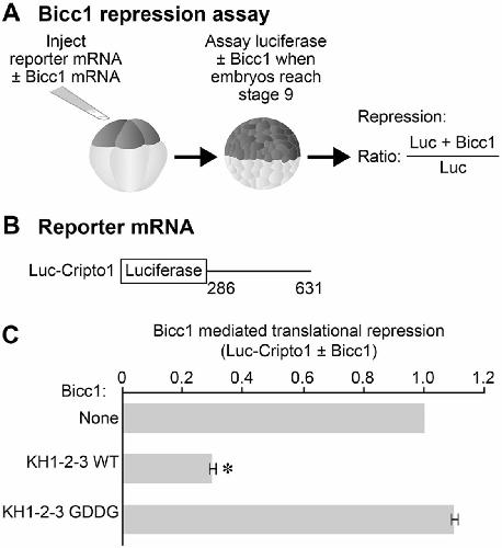 The Bicc1 KH domains are required for translational repression. (A) Animal cell assay for Bicc1 translational repression. Animal cells of eight-cell Xenopus embryos were injected with luciferase reporter mRNAs. Some of the embryos were given a second injection of mRNA encoding full-length Xenopus Bicc1 (Zhang et al., 2013). When embryos reached stage 9-10, luciferase assays were performed. Repression, measured by the ratio of luciferase exhibited by a reporter mRNA with and without Bicc1 expression, was calculated and plotted. (B) Diagram of Cripto1 3â²UTR fragment incorporated into luciferase reporter mRNAs used to analyze translational repression. (C) The Bicc1 protein containing GDDG substitutions (KH1-2-3 GDDG) was defective for repressing the Luc-Cripto1 reporter mRNA, while the Bicc1 wild-type protein repressed the reporter efficiently. Data are mean± s.e.m. from three separate experiments. *Pt-test) wild type compared with no Bicc1 control.