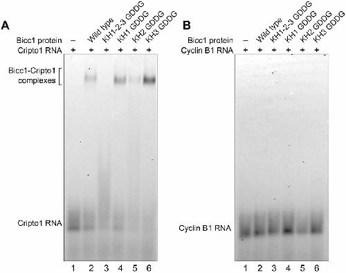 The Bicc1 KH2 domain is required for direct interaction with RNA targets. (A) Electromobility shift assays of Bicc1 wild-type and protein variants, and RNA substrate that is the Bicc1-binding site from the 3â²UTR of the Xenopus Cripto1 mRNA. Recombinant proteins consisting of the Bicc1 N terminus (amino acids 1-506) were expressed and purified from E.coli. Wild-type protein, along with KH1 GDDG, KH2 GDDG, KH3 GDDG and KH1-2-3 GDDG, were generated for analysis. Binding reactions consisting of the different proteins mixed with a fluorescently labeled 32 nucleotide RNA representing a well-characterized Bicc1-binding site derived from the 3â²UTR of the Xenopus Cripto1 mRNA were analyzed on native polyacrylamide gels electrophoresed horizontally (Dowdle et al., 2017). The KH2 GDDG and KH1-2-3 GDDG proteins were defective for complex formation compared with wild-type Bicc1 and other Bicc1 variants. (B) Electromobility shift assays of Bicc1 wild-type and protein variants, and an RNA substrate derived from the 3â²UTR of the Xenopus Cyclin B1 mRNA. The Cyclin B1 mRNA is not a Bicc1 target and represents a negative control for binding.