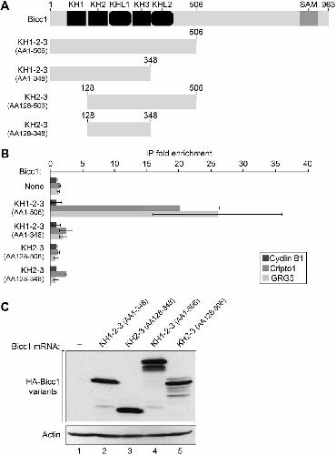 The entire N-terminal region of Bicc1 is required for RNA binding in vivo. (A) Diagram of the intact Bicc1 N-terminal region (KH1-2-3 amino acids 1-506) and the different derivatives that lack KHL2 (KH1-2-3 amino acids 1-348), lack KH1 (KH2-3 amino acids 128-506) or lack KH1 and KHL2 (KH2-3 amino acids 128-348). (B) The endogenous Xenopus maternal Cripto1 and GRG5 mRNAs were bound by the intact Bicc1 N terminus, but none of the derivatives lacking different regions bound to these mRNAs. None of the proteins bound to the Cyclin B1 mRNA, a negative control for this experiment as Cyclin B1 is not a Bicc1 target. Data are mean±s.e.m. from three separate experiments. (C) Immunoblot analysis with an anti-HA antibody was used to monitor the expression of the different protein variants used in RNA-binding assays.