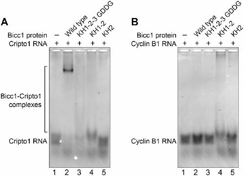 The KH2 domain is not sufficient for RNA binding. (A) Electromobility shift assays of Bicc1 wild-type and protein variants. Recombinant proteins consisting of the Bicc1 wild-type N terminus (amino acids 1-506), the KH1-2-3 GDDG protein (amino acids 1-506), KH1-2 protein (amino acids 41-201) and KH2 protein (amino acids 126-201) were expressed and purified from E.coli. Binding reactions consisting of the different proteins mixed with a fluorescently labeled 32-nucleotide RNA representing a well-characterized Bicc1-binding site derived from the 3â²UTR of the Xenopus Cripto1 mRNA were analyzed on native polyacrylamide gels electrophoresed horizontally (Dowdle et al., 2017). (B) Electromobility shift assays of Bicc1 wild-type and protein variants with an RNA substrate derived from the 3â²UTR of the Xenopus Cyclin B1 mRNA. The Cyclin B1 mRNA is not a Bicc1 target and represents a negative control for binding.