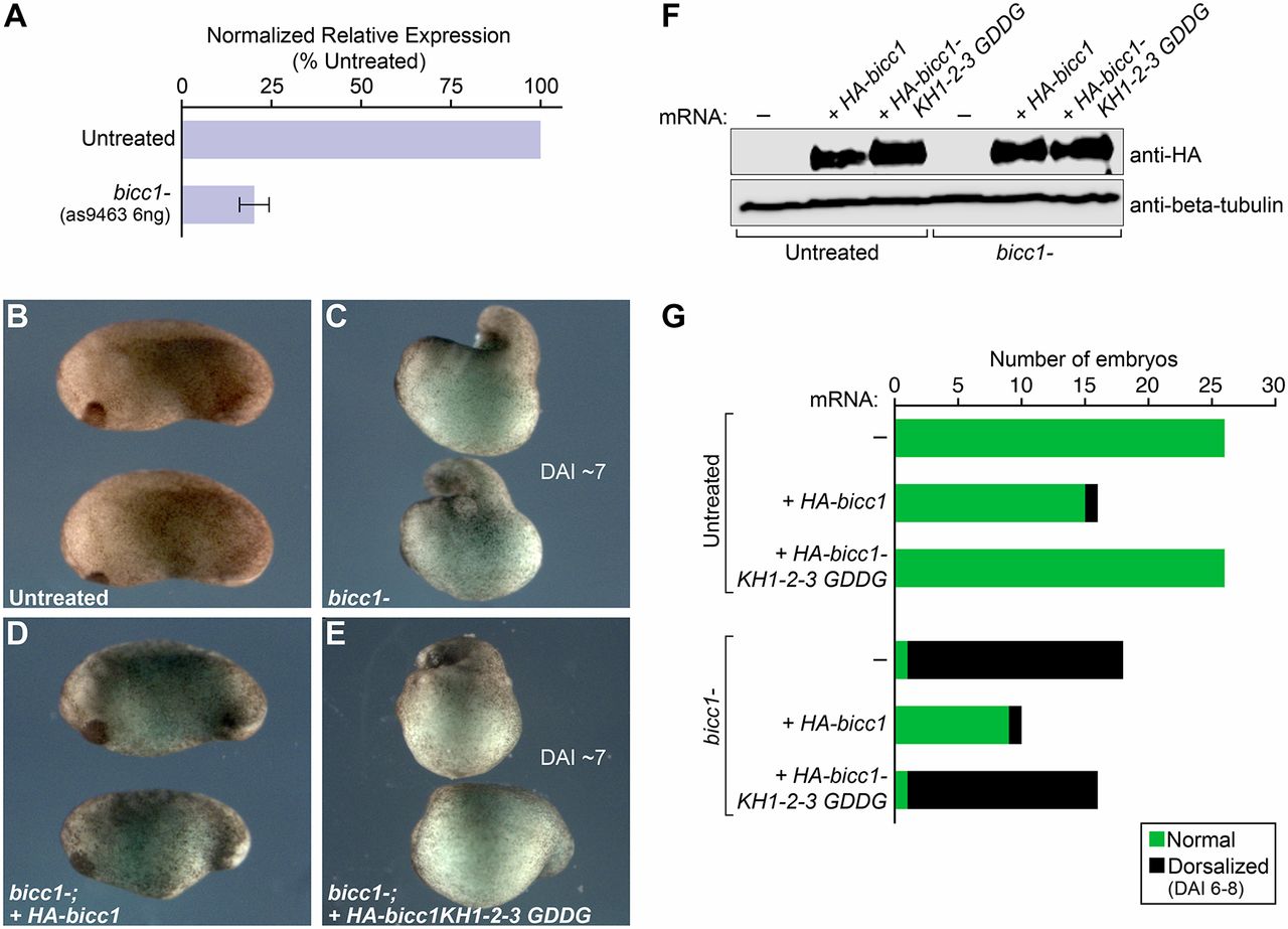 The Bicc1 KH domains are required for the function of Bicc1 in embryonic patterning. (A) Validated Bicc1 antisense phosphorothioate oligonucleotide (oligo 9463) was injected into oocytes and the oocytes matured overnight. Matured oocytes were treated with vital dyes, transferred to an ovulating host female and the laid eggs from manipulated oocytes were fertilized. (B-D) Phenotypes of control and sibling experimental Xenopus embryos. Summary presented in G. (B) Control embryos (stage 22). (C) Stage 22 embryos depleted of maternal bicc1 mRNA. The maternal knockout embryos develop with expanded dorsal-anterior structures (DAI 7). (D) The defects from depleting embryos of bicc1 were rescued by wild-type bicc1 mRNA. Embryos depleted of maternal bicc1 mRNA were injected at the vegetal pole with wild-type HA-bicc1 mRNA (20â pg). (E) The defects from depleting embryos of bicc1 were not rescued by KH1-2-3 GDDG bicc1 mRNA. Embryos depleted of maternal bicc1 mRNA were injected at the vegetal pole with KH1-2-3 GDDG bicc1 mRNA (20â pg). (F) The wild-type and KH1-2-3 GDDG Bicc1 proteins were expressed at comparable levels. Proteins from maternal knockout embryos injected with the different mRNAs were analyzed by immunoblotting and probing with an HA antibody. (G) Summary of the phenotypes from control, antisense oligo-injected host-transfer embryos and antisense oligo-injected host-transfer embryos co-injected with either mRNA encoding wild-type HA-Bicc1 or mRNA encoding HA-Bicc1 KH1,2,3 GDDG. The (+) samples received an injection of HA-bicc1 mRNA or HA-bicc1 KH1,2,3 GDDG mRNA whereas the (â) samples did not.