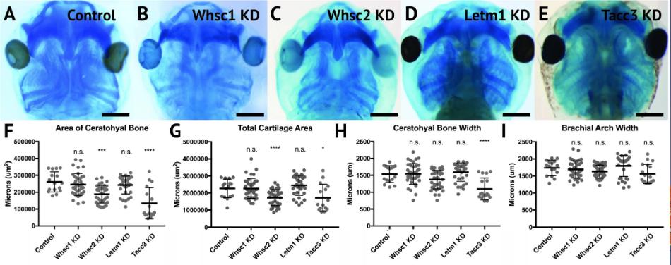 FIGURE 4. Knockdown of Whsc2 and Tacc3 impact cartilage morphology. (AâE) Ventral view of 6dpf embryos following single WHS-assoc. gene KD, stained with Alcian Blue to label cartilage elements. (FâI) Measurements of the average area and width of the ceratohyal cartilage, total cartilage area, and width of the brachial arches. Neither Whsc1 nor Letm1 KD caused a significant change in any measured parameter. Whsc2 KD caused a 27.94% decrease in average area of the ceratohyal cartilage, and a 23.87% decrease in area of all craniofacial cartilage. Tacc3 KD caused a 48.5% decrease in the average area of the ceratohyal cartilage, a 24.03% decrease in total cartilage area, and a 28.58% decrease in ceratohyal cartilage width. Significance was determined using a studentâs unpaired t-test. (Embryos quantified: Control = 17, Whsc1 KD = 41, Whsc2 KD = 39, Letm1 KD = 34, Tacc3 KD = 11.) ââââP < 0.0001, âââP < 0.001, âP < 0.05, n.s., not significant. Scalebar is 250μm. |