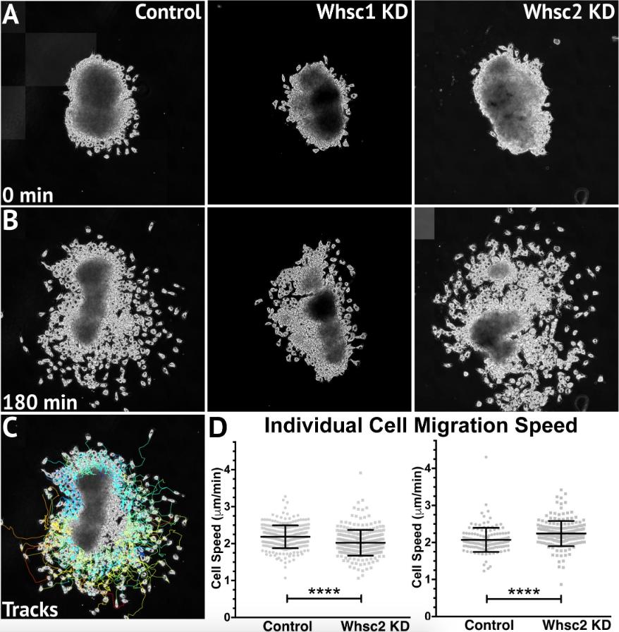 FIGURE 6. Whsc1 manipulation alters CNC migration speeds in vitro. Dissected CNC explants from control, Whsc1 KD, or Whsc2 KD embryos were plated on fibronectin-coated coverslips, allowed to adhere and begin migration, and imaged for 3 h using 20à phase microscopy. (A) Representative explants at initial timepoint (0 min). (B) Explants after 3 h migration time. (C) Representative tracks generated by FiJi Trackmate plug-in. (D) Mean track speeds of Whsc1 or Whsc2 KD explants compared to their controls. (Explants quantified: 3â4 explants from control and KD embryos were plated for each experiment, explants with neural or epithelial contaminant were excluded from analysis. Three separate experiments were performed for each depletion. Whsc1 controls: 272 cells, 9 explants. Whsc1 KD: 282 cells, 9 explants. Whsc2 controls: 151 cells, 12 explants. Whsc2 KD: 195 cells, 8 explants.) ââââP < 0.0001, n.s., not significant. Scalebar is 250μm. |