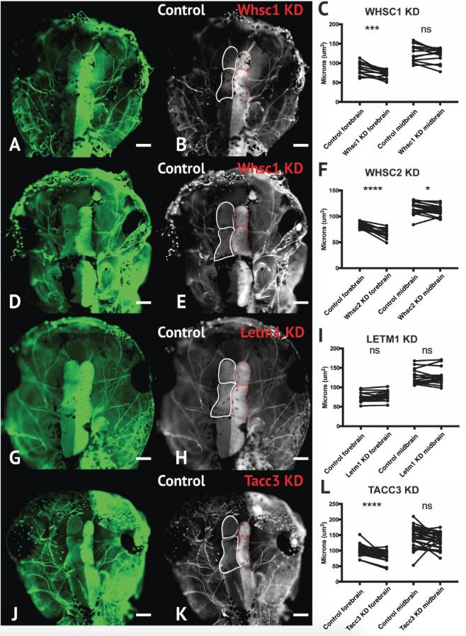FIGURE 7. Whsc1, whsc2, and tacc3 facilitate normal forebrain development. (A,B,D,E,G,H,J,K) Dorsal view of X. laevis half-embryo gene depletions (6 days post-fertilization), following alpha-tubulin immunolabeling to highlight nervous system. (B,E,H,K) Dorsal view of embryos with superimposed outlines of forebrain and midbrain structures. Internal control is on left (white), depleted side is on right (dashed red). (Alpha-tubulin staining is bilateral; exogenous eGFP on KD side persisted in embryos shown, causing a unilaterally enriched green signal.) (C,F,I,L) Area of forebrain and midbrain. Whsc1 KD reduced forebrain area by 17.65%. Whsc2 KD reduced forebrain area by 17.33% and midbrain area by 4.14%. Letm1 KD caused no significant change in brain size. Tacc3 KD caused a 16.05% decrease in forebrain area. Significance determined using a studentâs paired t-test. (Embryos quantified: Whsc1 KD = 14, Whsc2 KD = 18, Letm1 KD = 12, Tacc3 KD = 26.) ââââP < 0.0001, âââP < 0.001, âP < 0.05, n.s., not significant. Scalebar is 250 μm. |