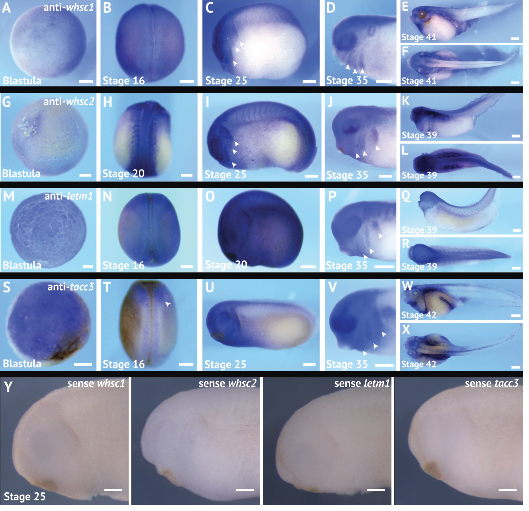 FIGURE S1 | Expression patterns for WHS related genes across early development. In situ hybridization utilized (AâF) antisense mRNA probe to whsc1, (GâL) full-length antisense mRNA probe to whsc2, (MâR) full-length antisense mRNA probe to letm1, and (S-X) 1 kb partial-length antisense mRNA probe to tacc3. Embryos shown at blastula stage (A,G,M,S), in dorsal view at stage 16â20 (B,H,N,T), in lateral view at stage 20â25 (C,I,O,U), detail of lateral anterior region at stage 35 (D,J,P,V), and in both lateral and dorsal views from stages 39â42 (E,K,Q,W and F,L,R,X). (Y) In situ hybridization probes generated against sense strands of WHS gene mRNAs, shown at stage 25. Brown coloration (S,T) is unbleached pigment, unrelated to in situ hybridization staining. Scalebar is 250 μm.bryos were anesthetized with benzocaine. |