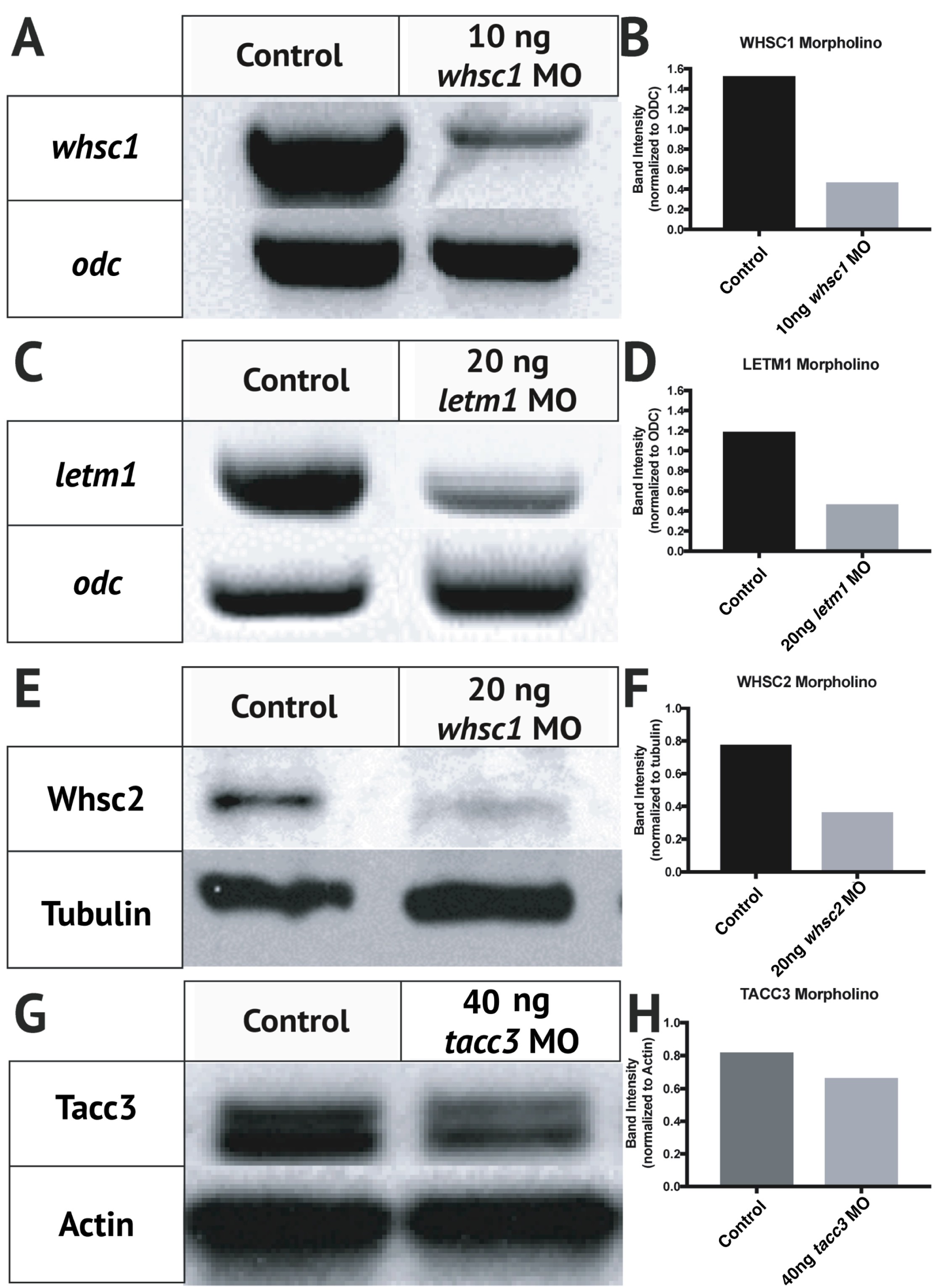 FIGURE S2 | Validation of WHS related MOs. (A,B) Gel of polymerase chain reaction (PCR) that shows injection of 10 ng MO targeted to whsc1 mRNA causes a greater than 80% reduction at 2 dpf. (C,D) Injection of 20 ng of a MO targeted against letm1 causes an 55% decrease in letm1 mRNA 2 dpf. (E,F) Western blot showing 10 ng injection of a MO targeted against whsc2 results in a greater than 50% reduction in Whsc2 protein by 2 dpf. (G,H) Western blot showing 40 ng of a MO targeted against tacc3 results in 22% reduction. Bar graphs (B,D,F,H) depict densitometry of gels (A,C) or blot (E,G) shown, but is consistent across triplicate results. |