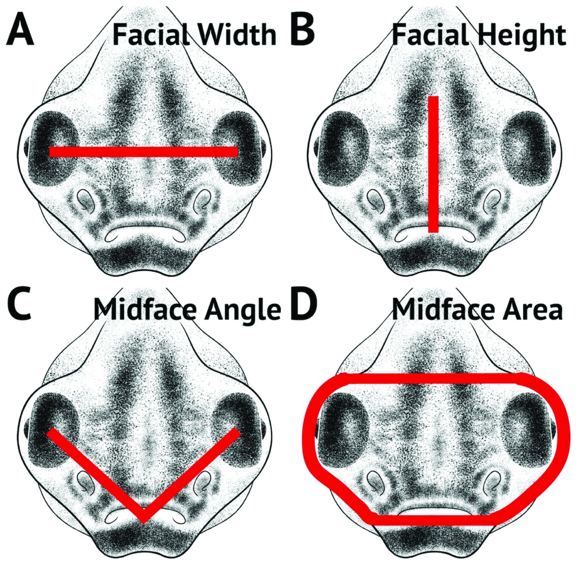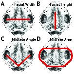 FIGURE S3 | Demonstration of measurement schemes for craniofacial morphology. Measurements for Figure 3 and Supplementary Figure S4 were performed as indicated. (A) Facial width was measured from the center of each eye. (B) Facial height was determined at the midline, from the top of the cement gland to the top of the eyes. (C) Midface angle was measured from the top of the cement gland to the center of each eye. (D) Facial area was measured as the space encapsulated within the perimeter of each eye. Adapted from Kennedy and Dickinson (2014). |