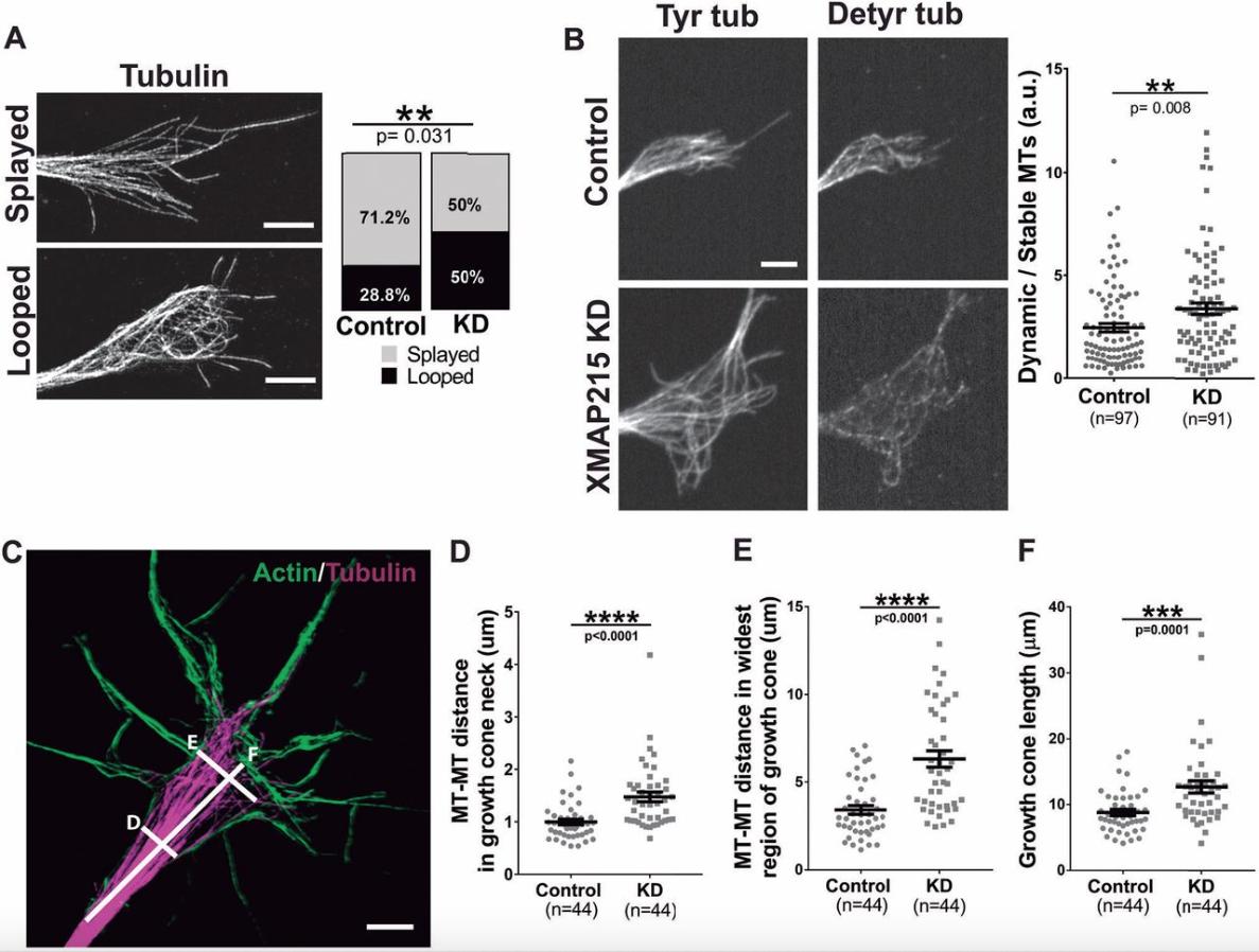 Figure 2: XMAP215 KD disrupts MT organization in the growth cone. (A) Representative SIM images of growth cone MTs considered as âsplayedâ and âloopedâ. XMAP215 KD increases the MT looped morphology compared to controls. Scale bar: 3â µm. (B) Representative growth cone images of control and XMAP215 KD neural explants immunostained for tyrosinated tubulin (Tyr tub) and detyrosinated tubulin (Detyr tub) to label dynamic versus stable MTs, respectively. XMAP215 KD increases the dynamic:stable MT ratio. Scale bar: 5â µm. a.u., arbitrary units. (C) Representative SIM image of growth cones stained for actin and tubulin. The labeled lines letter indicate how the MT measurements were performed for the corresponding plots in DâF. Scale bar: 8â µm. (DâF) Quantification of the different MT parameters. XMAP215 KD increases the MTâMT distance in growth cone neck (D), the MTâMT distance in the growth cone's widest region (E), as well as the growth cone length (F). **P<0.01; ***P<0.001; ****P<0.0001; ns, not significant, from a Student's t-test comparing XMAP215 KD to control. Data presented as mean±s.e.m. |