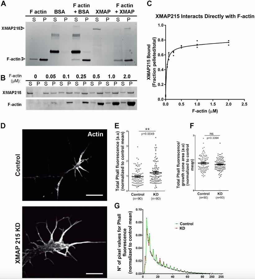 Figure 7: XMAP215 can directly bind to F-actin but does not affect local F-actin density. (A,B). XMAP215âF-actin co-sedimentation assays. Coomassie Blue-stained gels from binding assays containing a constant F-actin concentration (A) or increasing F-actin concentrations (B), show direct binding of XMAP215 to F-actin. BSA was used as a negative control. S, supernatant; P, pellet. (C) XMAP215âF-actin binding curve obtained by plotting the percentage of XMAP215 present in the pelleted fraction over the total, against the F-actin concentration. Data points from multiple experiments plotted for each concentration. Non-linearly fit binding curve displays a Kd value at a sub-micromolar binding affinity, 0.032±0.0051â µM (mean±s.e.m.). Bmax=0.682±0.0283. (D) Representative phalloidin-stained images of growth cones from control and XMAP215 KD neural explants. Scale bars: 10â µm. (EâG) Quantification of F-actin amount and distribution. XMAP215 KD increases total phalloidin fluorescence (E), while it does not affect phalloidin fluorescence normalized by growth cone area (F) or the number of pixel values for phalloidin fluorescence (G). a.u., arbitrary units; Phall, phalloidin. **P<0.01; ns, not significant, from Student's t-test comparing XMAP215 KD to control. Data presented as mean±s.e.m. |
