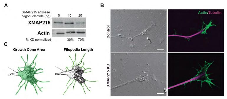 Figure S1. A. Western blot showing increasing levels of XMAP215 knockdown with increasing levels of antisense oligonucleotide. Actin was used as a loading control. B. DIC images (left) and actin and tubulin merge images (right) of growth cones from control and XMAP215 KD neural explants. Scale bar: 5 µm. C. Diagrams illustrating the measurements taken to analyze either growth cone area (left), or filopodia length (right) following XMAP215 KD, rescue, or OE. Structures analyzed are highlighted in green. Growth cone measurements correspond to data shown in Fig. 1A. Average filopodia length corresponds to data shown in Fig. 1C. |