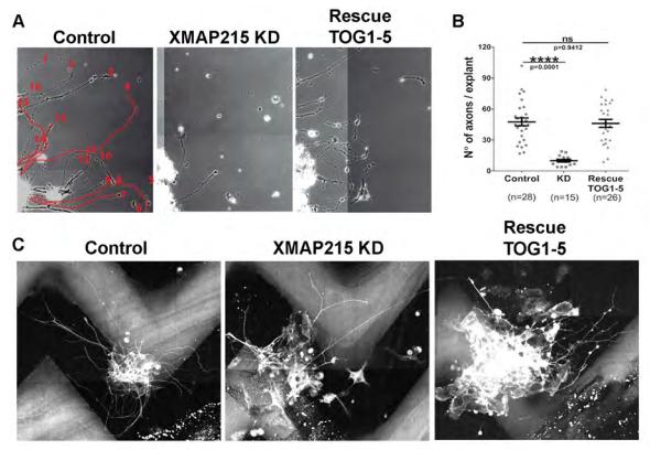 Supplemental Figure 2. (A-B) TOG1-5 rescues the axon outgrowth parameters affected by XMAP215 KD. A. Phase contrast images of axons from control, XMAP215 KD and XMAP215 KD rescued by TOG1-5 neural explants. Red numbers are shown as an example of axons considered for number of axon per explants quantifications. Only the axons with a clear end or growth cone were considered. Red lines denote the axon length, with only axons starting from the spinal cord explants, that are clearly separated from other axons and with a clear end or growth cone, were considered. B. XMAP215 KD decreases the number of axons per explant and can be rescued by TOG1-5 mRNA. C. Representative images from control, XMAP215 KD and XMAP215 KD rescued by TOG1-5 neural explants. Explants expressing LifeAct (F-actin marker). Grey stripes correspond to repellent EphrinA5-coated surface. Measurements taken of axons that were present and crossed onto repellent ephrin stripes per explant. |