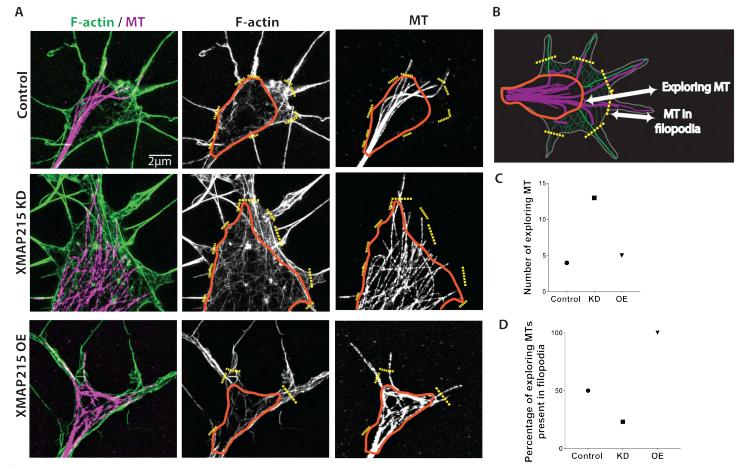 Figure S3. Example of the measurements taken of MT and actin-stained SIM imaging, corresponding to data displayed in Figure 3. A. Representative images of control, XMAP215 KD and XMAP215 OE growth cone stained for F-actin, MT and merge. Orange lines delineate the central domain, the beginning of the actin mesh is considered as the limit of the central domain, and the yellow dotted lines denotes the beginning of the filopodia. B. Growth cone cartoon showing that MTs that progress out of the central domain (orange line) are considered âexploring MTsâ, and the ones progressing beyond the doted yellow lines are considered âMTs present in the filopodiaâ. C-D. Quantification of the number of exploring MTs (C), and percentage of exploring MTs present in filopodia (D) of the example in A. |