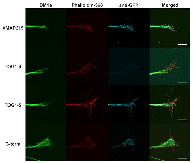 Figure S4. XMAP215 deletion constructs show distinct localizations with microtubules and F-actin in the growth cone. XMAP215 full-length or deletion mutants were expressed in Xenopus neural explants, fixed, and labelled with antibodies to GFP (labeling the XMAP215), microtubules, and actin. Representative images highlight microtubules (DM1a â green), Actin (phalloidin568 â red), XMAP215 deletion constructs (a-GFP - cyan), or a merged image of the three channels. |