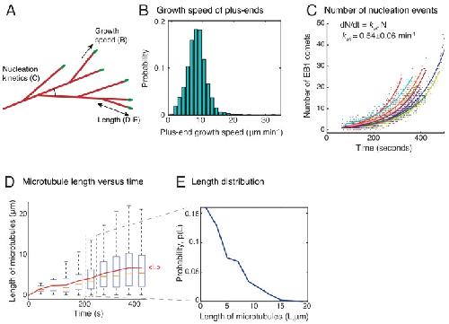Figure 1—figure supplement 2. Characterization of branched microtubule networks.(A) Schematic representation of a branched network depicting parameters measured in (B–E). (B) Growth speed of plus-ends was obtained from EB1 tracks as described in Materials and methods. Histogram of n = 1691 EB1 tracks is displayed where all data was pooled from 20 branched networks. Mean growth speed was measured as 8.3 ± 2.5 μm min−1. Analyses in (B–E) are displayed for multiple branched networks generated in one Xenopus egg extract preparation, and were repeated with at least two independent egg extract preparations. (C) Number of EB1 comets were detected individually in 11 branched networks and plotted over time. Exponential curve [a exp(kt)] was fit to data points for each network, representing autocatalytic nucleation, and displayed in different colors. (D) Length of all MTs tracked in 20 branched networks was measured over time and plotted. The central mark displays the median length (yellow), and the edges of the box represent 25th and 75th percentiles. New MTs nucleated represent the near-zero lengths at later time points. The overlaid red curve represents the mean MT length over time. (E) Probability distribution of length of all MTs between 200–250 s is plotted. Data was pooled from 20 branched networks. |