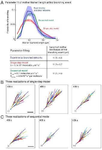 Figure 1—figure supplement 3. Stochastic models of branched microtubule networks.(A) Distribution of mother MT lengths at the first branching event, used for parameter estimation of the single-step model and the sequential model, is displayed. The fit parameters are tabulated below. Number of measurements: n = 381 experimental measurements, and n = 4000 measurements for each model. (B–C) Three stochastic simulations of (B) the single-step model, and (C) the sequential model are displayed using parameters in (A). Individual MTs are labelled in rotating color scheme. Scale bar, 10 μm. See Figure 1, Videos 3 and 4. |