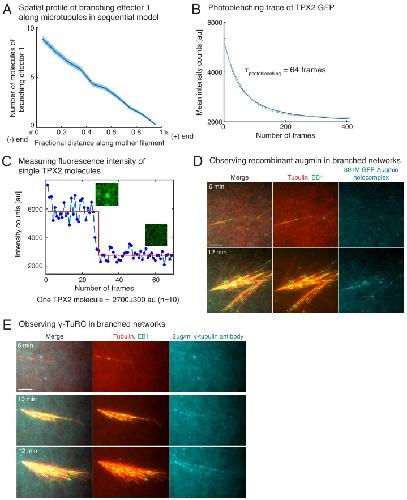 Figure 4—figure supplement 2. Controls for TPX2’s binding rate measurement, and visualization of augmin/γ-TuRC on branched networks.(A) Distribution of branching effector1 in sequential model was measured along the length of mother MT at 100 s. The number of molecules is plotted after rescaling the length of mother MT to 1 (n = 250 measurements). Shaded regions depict the 95% bootstrap confidence interval. (B–C) Fluorescence photobleaching of GFP-TPX2 was performed by attaching TPX2 to untreated glass coverslips. Mean fluorescence in the field of view was plotted over time in (B) and exponential decay curve was fit to obtain the photobleaching time as 64 frames. Because this time scale is significantly longer than the number of frames used to obtain TPX2’s binding rate from intensity versus time traces in Figure 4E, the effect of fluorescence photobleaching was ignored. Photobleaching step of individual TPX2 molecules was observed to obtain the fluorescence count of a single TPX2 molecule at its center pixel. A representative trace is shown in (C, blue circles), and data was fit to Heaviside function (red curve) using MATLAB curve-fit. Fluorescence of single TPX2 molecule was measured as 2700 ± 300 au (n = 10 traces). (D–E) Observation of augmin and γ-TuRC during branched network formation. Recombinant GFP-augmin holocomplex was added at 30 nM to Xenopus egg extracts. Branched MT networks were generated with 10 μM RanQ69L, and time-lapse of augmin on the networks was recorded in (D). MTs are labeled with Cy5-tubulin (red), their plus-ends with EB1 (green), and augmin is displayed in cyan. 0 s marks the start of the reaction. Alexa-647 labelled XenC antibody against γ-TuRC was added to Xenopus egg extracts at 2 μg/ml in (E). Branched MT networks were generated with 10 μM RanQ69L, and time-lapse of γ-TuRC on the networks was recorded. MTs are labeled with Alexa-488 tubulin (pseudo-colored as red), their plus-ends with EB1 (green), and augmin is γ-TuRC in cyan. 0 s marks the start of the reaction. Both augmin and γ-TuRC are not visible on individual MTs, but appear later as more MTs nucleate in the branched networks. Scale bars, 10 μm. The experiments were repeated thrice with independent egg extract preparations. |