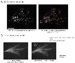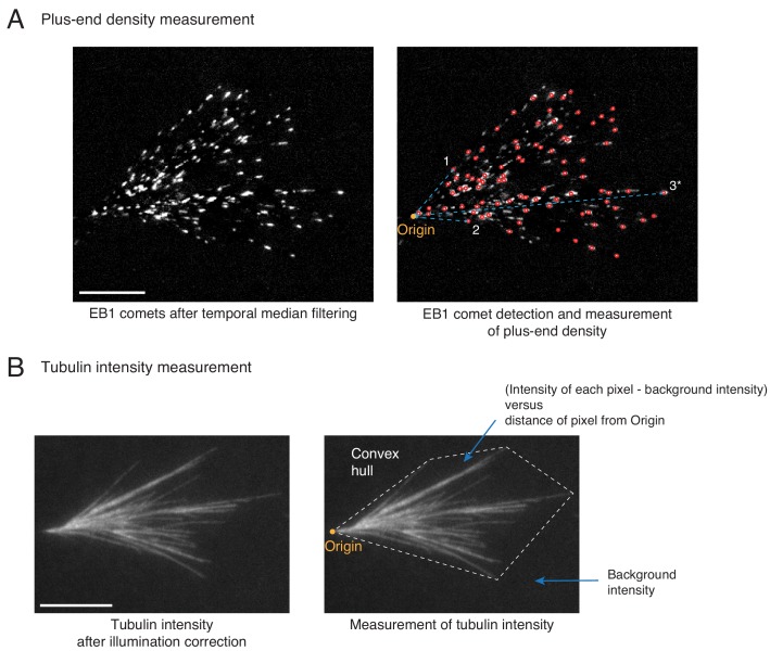 Figure 2—figure supplement 2. Spatial organization of microtubules in dense branched networks.(A) Distribution of MT plus-ends was measured in dense branched networks as follows. EB1 comets were pre-processed (left panel) and detected (red circles, right panel) as described in Materials and methods. The cartesian distances of all EB1 comets from the origin (yellow, right panel) were measured. Three example measurements are illustrated with cyan line segments. All distances were normalized by the longest distance (marked 3*) for each branched network. Measurements were pooled from multiple branched networks and the probability distribution was reported in Figure 2D. Scale bar, 10 μm. (B) Tubulin intensity was measured in dense branched networks as follows. Background illumination was corrected for the tubulin intensity as described in Materials and methods. The convex hull around the branched network was generated (dashed boundary, right panel) and average intensity outside the image was subtracted. For all pixels within the convex hull, the subtracted intensity was recorded and their distances from the origin was measured. All distances were normalized by the longest distance of any vertex of the convex hull from origin for each branched network. For any specified distance, all measured intensities were pooled from multiple branched networks and reported in Figure 2D. Scale bar, 10 μm. |