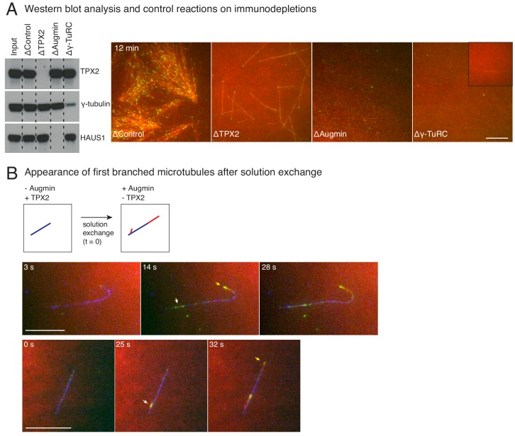 Figure 4—figure supplement 1. Control immunodepletion reactions and measurement of length of initial branched microtubules.(A) Augmin, TPX2 or γ-TuRC were immunodepleted from Xenopus egg extracts, and western blot analysis against TPX2, γ-tubulin or HAUS1 (augmin subunit) was performed to verify depletion. Branching MT nucleation assay was performed by addition of 10 μM RanQ69L. Representative images at 12 min of the reaction show loss of branching MT nucleation upon augmin or TPX2 immunodepletion, and severe reduction in overall level of nucleation upon γ-TuRC immunodepletion. Low level of γ-TuRCs remain in egg extracts upon immunodepletion with anti-XenC antibody, resulting in rare MTs shown in inset. Scale bar, 10 μm. This analysis was repeated twice with independent egg extract preparations, and the same extracts were used for experiments shown in Figure 4A–C. (B) De novo MTs (blue) were generated by performing branching reaction in Xenopus egg extracts where no augmin is present. Non MT-bound, soluble proteins were removed with buffer wash. The reaction was observed while exchanging the solution to egg extracts containing augmin but no TPX2 at time t = 0 s. Branched MTs (red, denoted with white arrows) and their plus-ends labelled with EB1-mCherry (pseudo-colored as green), nucleated within 10–30 s from de novo MTs (blue) MT, and roughly at the same time as the elongating plus-end (yellow arrows). Scale bar, 10 μm. The experiment was repeated twice with independent egg extract preparations. |