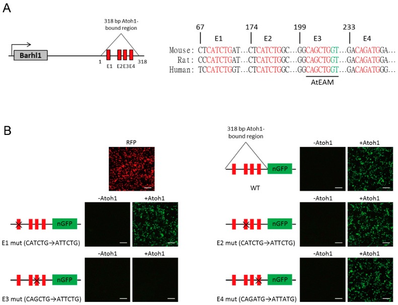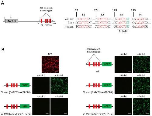 Figure 2. Atoh1 activates Barhl1 expression through an essential E-box motif in the 3′ enhancer region. (A) Schematic of the 318 bp Atoh1-bound region downstream of Barhl1 indicating the E-boxes and their conservation among mouse, rat, and human. (B) Transcriptional activity of Atoh1 on E-box mutation constructs of the Barhl1 3’ enhancer. Reporter contains the Barhl1 enhancer (Wild Type, WT) or the enhancer carrying an E-box mutation (E1 mut, CATCTG was mutated to ATTCTG; E2 mut, CATCTG was mutated to ATTCTG; E3 mut, CAGCTG was mutated to ATTCTG and E4 mut, CAGATG was mutated to ATTATG) was co-transfected with a control (empty vector) or a plasmid expressing Atoh1. Expression of red fluorescent protein (RFP) indicated the efficiency of transfection. The enhancer-reporter activity was determined by n green fluorescent protein (nGFP) fluorescence after 48 h. Results indicate that this E3 site is critical for Atoh1-mediated Barhl1 activation. Scale bars, 200 µm. |