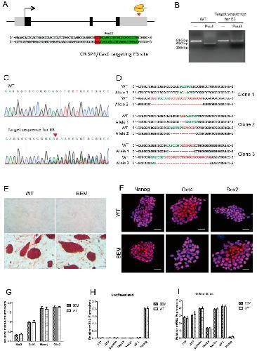 Figure 3. Generation and characterization of Barhl1 E3-box mutated (BEM) mouse embryonic stem cell (mESC) lines. (A) Schematic diagram showing the position of target site of CRISPR/Cas9 in the Barhl1 E3 site. Gray/black boxes, exons; black boxes, Barhl1 coding sequence (CDS); solid line between black boxes, introns; black arrow, direction of transcription; red arrowheads, indicating target sites of CRISPR/Cas9 in the Barhl1 E3 site. Sequence of target sequence for the E3 site (indicated by green) carrying a cleavage site of PvuII and the protospacer adjacent motif (PAM, indicated by red) were displayed in detail. (B) Restriction digestion of 616bp polymerase chain reaction (PCR) product of the E3 site by PvuII. The WT E3 site instead of the mutated E3 site can be digested into 430 and 186 bp. PCR products without enzymatic digestion were used as controls. (C) The sequencing peak map of the WT E3 site and the mutated E3 site. Multiple peaks were shown at the mutated E3 site instead of a single peak in the WT E3 site. (D) Sanger sequencing revealed compound heterozygous E3 site mutations occurred in all three selected clones, Clone1 (29 and 2 bp deletion), Clone2 (14 and 4 bp deletion) and Clone3 (30 and 14bp). Clone1 was picked for further analysis and named as BEM line. (E) Phase contrast microscopy and alkaline phosphatase (AP) staining of WT mESCs and BEM line. Scale bars, 25 µm. (F) Immunostaining analyses of embryonic stem cell (ESC) markers Nanog, Oct4 and Sox2 in WT mESCs and BEM line. Scale bars, 20 µm. (G) Quantitative Real-Time polymerase chain reaction (qRT-PCR) analyses for expression of ESC markers Sox2, Oct4, Nanog, and Gbx2 in WT mESCs and BEM line. No significant differences in the mRNA expression levels of Sox2, Oct4, Nanog, and Gbx2 between both kinds of mESCs were found. Data are mean ± SEM (n = 3). (H,I) qRT-PCR analyses for expression of germ layer-specific markers AFP and TTR (endoderm), ζ-globin and Nkx2.5 (mesoderm), Nestin and NF-L (ectoderm), and ESC marker Nanog. RNA was isolated from the undifferentiated WT mESCs and BEM line (H), and cells after spontaneous differentiation (I). All of three germ layer-specific markers were found to be upregulated upon spontaneous differentiation of two kinds of mESCs, and no significant differences in their transcript levels were found. Undifferentiated: The undifferentiated mESCs; differentiated: The in vitro spontaneously differentiated cells. Data are mean ± SEM (n = 3). |