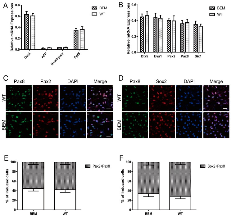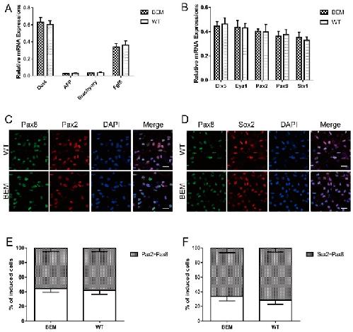 Figure 4. Targeted disruption of the essential E-box in Barhl1 enhancer does not affect induction of EPL cells and otic progenitors from mESCs. (A) qRT-PCR analyses for expression of pluripotent cell-related marker Oct4, visceral endoderm-related marker AFP, mesoderm-related marker Brachyury, and primitive ectoderm-related marker Fgf5 in cell aggregates derived from WT and BEM mESCs on day 7. There were no significant differences in the mRNA expression levels of Oct4 and Fgf5 between two kinds of mESC-derived cells and no significant expressions of AFP and Brachyury in these induced cells, indicating the transition of both mESCs to EPL cells. Data are mean ± SEM (n = 3). (B) qRT-PCR analyses for expression of otic markers Dlx5, Eya1, Pax2, Pax8, and Six1 in WT-and BEM-derived cultures at day 21. No significant differences in the mRNA expression levels of Dlx5, Eya1, Pax2, Pax8, and Six1 between both kinds of mESC-derived cells were detected. Data are mean ± SEM (n = 3). (C,D) Immunostaining analyses of otic markers Pax2/Pax8 (C) and Pax8/Sox2 (D) in WT- and BEM-derived cultures at day 21. Scale bars, 20 μm. (E,F) The percentages of double-immunopositive cells for Pax2/Pax8 (E) and Pax8/Sox2 (F) in WT- and BEM-derived cultures at day 21. There were no significant differences in the percentages of double-immunopositive cells for Pax2/Pax8 and Pax8/Sox2 between these two mESC-derived cells. Data are mean ± SEM (n = 3). |