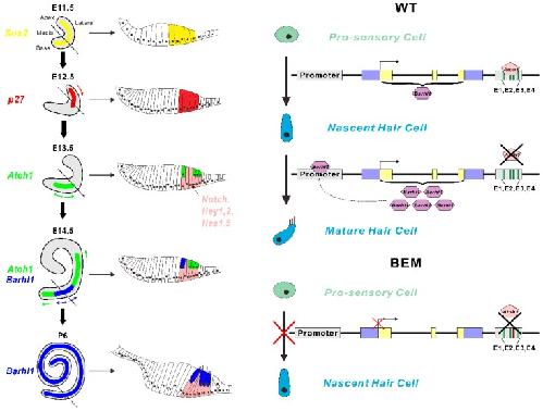 Figure 7. Atoh1-regulated Barhl1 expression during the organ of Corti development. Left panel: A concise outline of the cochlear development with cross sections at corresponding periods listed next to it. The cochlear duct commences with an expansion of the ventral part of the otocyst. A diagram of the entire cochlea at E11.5 highlights the expression of Sox2 (indicated by yellow) in the pro-sensory region. Several cyclin-dependent kinase inhibitors urge the pro-sensory cells to exit from cell cycles and this withdrawal originates from the apex and extends towards the base at E12.5. The gradient expression of p27 (indicated by red arrow) is consistent with the direction of cell cycle exit in the cochlea. Then the pro-sensory cells are guided into hair cell fate and supporting cell fate separately by Atoh1 and Notch signaling pathways. Atoh1 first expresses in the post mitotic pro-sensory region at E13.5, which signifies the beginning of hair cell differentiation. Then Atoh1 expands its expression from the midbase to both the apex and base of the duct bidirectionally (indicated by green arrows). Notch, Hey1,2, and Hes1,5 (indicated by pink) direct pro-sensory cells to supporting cells. For the survival and maintenance of hair cells, multiple cell signaling pathways and genes are involved. Barhl1 first appears at E14.5 in the mid-base of cochlea and its expression pattern (indicated by blue arrows) follows that of Atoh1. At P6, Atoh1 expression ceases while Barhl1 expression continues to maintain the normal function of hair cells. Right panel: Schematics showing Atoh1 drives Barhl1 expression through the E3 site in the 3â² enhancer. In the WT cell line, Atoh1 binds to the E3 site located at the 3â² enhancer to activate Barhl1 expression, thereby driving the differentiation of pro-sensory cells into nascent hair cells. When Atoh1 stops its expression at P6, Barhl1 can bind to the promoter region to maintain its own expression to form mature hair cells. However, in the BEM cell line, since Atoh1 cannot bind to the mutated E3 site in the 3â² enhancer, the expression of Barhl1 failed to be activated, leading to the failure of nascent hair cell differentiation from pro-sensory cells. Blue boxes, UTRs; yellow boxes, Barhl1 coding sequence (CDS); gray boxes, promoter and enhancer; black arrow, direction of transcription. |
