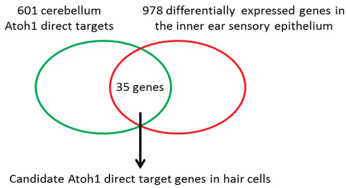 Figure 1. Potential Atoh1 direct target genes in hair cells. Schematic shows that by cross-referencing the 601 cerebellum Atoh1 direct target genes previously identified by Klisch et al. (2011) and 978 differentially expressed genes in the inner ear sensory epithelium identified by Scheffer et al. (2015), 35 genes were selected as candidates Atoh1 direct targets in hair cells. |