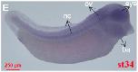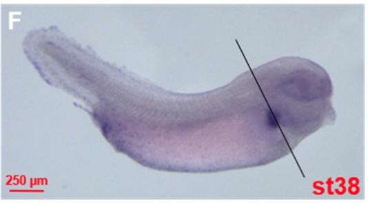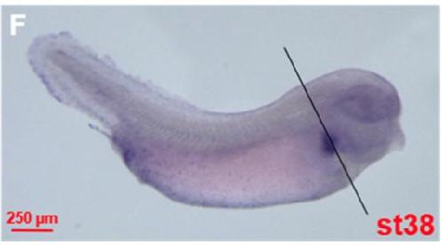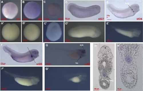 Fig. 4. Spatial pattern of fosl2analyzed by whole mount in situ hybridization. (A and Aâ²) Stage 2, animal view. (B and Bâ²) Stage 8, animal view. (C and Câ²) Stage 13, dorsal view. (D and Dâ²) Stage 27, dorsal view. (E and Eâ²) Stage 34, lateral view. (F and Fâ²) Stage 38, lateral view. (G and Gâ²) Stage 42, lateral view. (H) Transverse sections of embryos at the levels illustrated by broken black lines in F. (Hâ²) Large magnification of image shown in H. Ba, branchial arch; nc, notochord. Aâ²-Gâ² indicates the sense probe control.