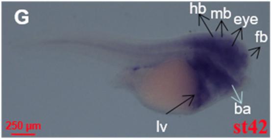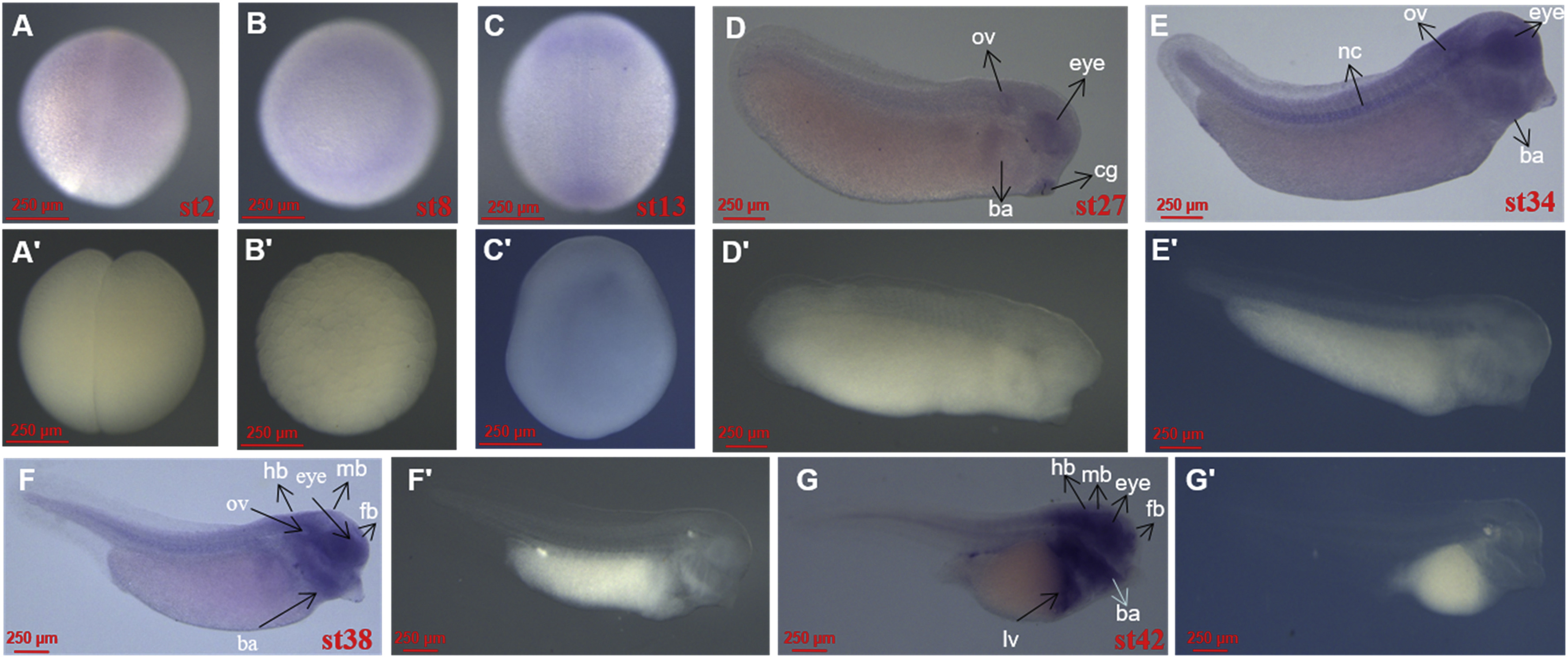 Fig. 3. Spatial pattern of fosl1 analyzed by whole mount in situ hybridization. (A and Aâ²) Stage 2, animal view. (B and Bâ²) Stage 8, animal view. (C and Câ²) Stage 13, dorsal view. (D and Dâ²) Stage 27, dorsal view. (E and Eâ²) Stage 34, lateral view. (F and Fâ²) Stage 38, lateral view. (G and Gâ²) Stage 42, lateral view. Ba, branchial arches; cb, cement gland; fb, forebrain; mb, midbrain; hb, hindbrain; lv, liver; nc, notochord; ov, otic vesicle. Aâ²-Gâ² indicates the sense probe control.