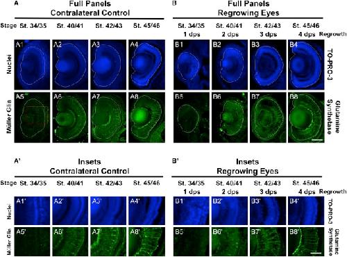FIGURE 2. Regrown eyes regain retinal differentiation by 3 dps. Images shown are immunostained, transverse sections at three developmental timepoints corresponding to 1, 2, and 3 days post surgery (dps). (A,B) The contralateral control eyes (unoperated) complete retinogenesis by st. 41. By 1 dps, RPE is already visible in the regrowing eye as shown by anti-RPE65 signal (retinal pigmented epithelium; green). By 3 dps, Islet1 expression (identifying subpopulations of retinal ganglion cells and subsets of amacrine cells, bipolar cells, and horizontal cells; green) show expected retinal patterning of a mature eye. White dashed lines delineate each eye. (Aâ,Bâ) Images shown in panels Aâ and Bâ correspond to the region shown in the inset box in panel A4 for the corresponding (A or B) panel at high magnification. Blue color indicates nuclear staining (TO-PRO-3). Sample sizes: 1 day, n = 5; 2 days, n = 7; and 3 days, n = 6. (A,B, Aâ,Bâ) Up = dorsal, down = ventral, lens is on the left. Scale bar: (A,B) = 100 μm and (Aâ,Bâ) = 50 μm. |