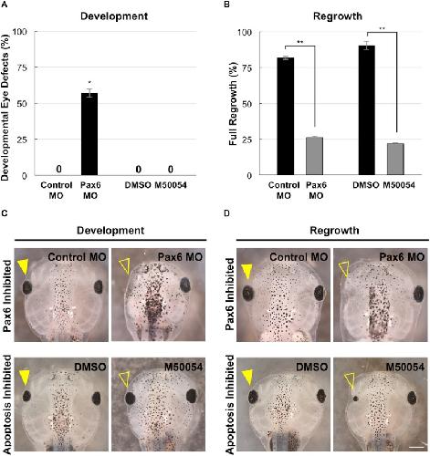 FIGURE 7. Development and regrowth require Pax6, but only regrowth requires apoptosis. (A) Comparison of developmental eye defects percentage from embryos injected at the 4-cell stage (1 blastomere) with either the control or Pax6 morpholino or treated with DMSO control or M50054 at st. 10. A zero denotes no abnormal phenotype in the control by st. 27. âdenotes p < 0.05 (n > 90). Data are means ± SEM. (B) Graphical representation of tadpoles achieving full eye regrowth at 5 dps (st. 46) with morpholino injection or apoptosis inhibitor treatment. ââdenotes p < 0.01 (n > 20). Data are means ± SEM. (C,D) Comparison of requirements for eye development and regrowth. (C) Pax6 morpholino injected tadpoles show reduced eyes when compared to the control by st. 46 in development. Apoptosis inhibitor show no effect on eye development (n > 30 per condition). Closed yellow arrowhead indicates eye of control, untreated tadpole. Open yellow arrowhead indicates eye of treated tadpole. (D) Pax6 morpholino and apoptosis inhibitor affects eye regrowth (n > 30). Closed yellow arrowhead indicates the eye of a control, untreated tadpole. Open yellow arrowhead indicates the eye of an inhibitor treated tadpole. (C,D) Up = anterior, down = posterior. Scale bar: C,D = 500 μm. |