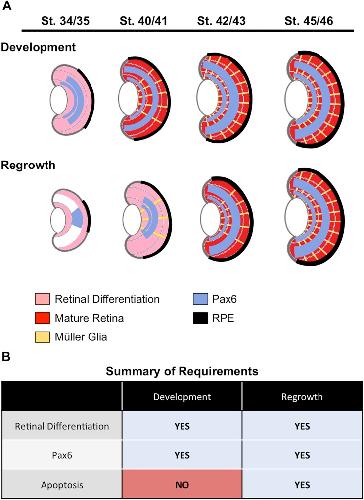 FIGURE 8. Summary. (A) A summary of retinal cell differentiation during regrowth as compared to development. The stages correspond to 1, 2, 3, and 4 days post surgery (dps), respectively. (B) Summary of required processes identified in eye development and regrowth. |