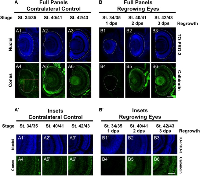 FIGURE 3. Regrown eyes regain cone differentiation by 3 dps. Images shown are immunostained, transverse sections at three developmental timepoints corresponding to 1, 2, and 3 days post surgery (dps). (A,B) Differentiation of cone photoreceptor cells is delayed during 1, 2 dps but regains patterning that is comparable to contralateral control eyes (unoperated) by 3 days. White dashed lines delineate each eye. (A’,B’) Images shown in panels A’ and B’ correspond to the region shown in the inset box in panel A4 for the corresponding A or B panel at high magnification. Blue color indicates nuclear staining (TO-PRO-3). Green color indicates anti-Calbindin signal (cone photoreceptors). Sample sizes: 1 day, n = 6; 2 days, n = 5; and 3 days, n = 6. (A,B, A’,B’) Up = dorsal, down = ventral, lens is on the left. Scale bar: A,B = 100 μm and A’,B’ = 50 μm. |