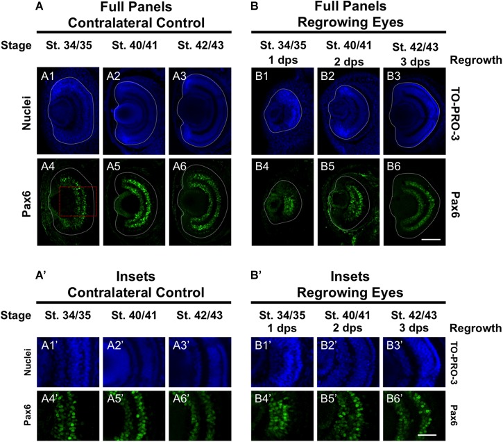 FIGURE 6. Regrown eyes regain Pax6 patterning by 3 dps. Images shown are immunostained, transverse sections at three developmental timepoints corresponding to 1, 2, and 3 days post surgery (dps). (A,B) Pax6 expression in the regrowing eye is less organized at 1 dps but regains patterning similar to contralateral control eyes (unoperated) by 3 dps. White dashed lines delineate each regrowing eye. (A’,B’) Images shown in panels A’ and B’ correspond to the region shown in the inset box in panel A4 for the corresponding A or B panel at high magnification. Blue color indicates nuclear staining (TO-PRO-3). Green color indicates anti-Pax6 signal. Sample sizes: 1 day, n = 5; 2 days, n = 7; and 3 days, n = 6. (A,B, A’,B’) Up = dorsal, down = ventral, lens is on the left. Scale bar: A,B = 100 μm and A’,B’ = 50 μm. |