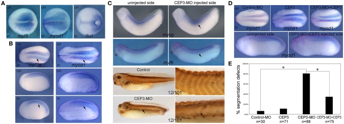 Figure 2. Cdc42ep3-MO affected the expression of somitic genes. (AC) Embyros were injected with 10 ng of CEP3-MO on one side, and the expression of somitic genes were compared between injected and uninjected sides. At the late gastrula stage (stage 15), CEP3-MO did not affect the expression of mesodermal genes myf5 or myod1 or pan-mesodermal gene tbxt (Xbra). At the early neurula stage (stage 22), the expression of mef2d and myod1 shows a segmented pattern in the uninjected side, but not in the CEP3-MO-injected side (arrows). At late tailbud stages, the segmented expression pattern, but not the overall expression level of myogenic genes myog and myf6 was affected by CEP3-MO. Similar segmentation defect was observed in embryos stained with 12/101 antibody. (D) While 0.3ng CEP3 alone did not induce obvious segmentation defect, coinjection of CEP3 with CEP3-MO partially rescued the segmentation defects. Dorsal view (A, top panels in B, and top panels in D) or lateral view (bottom panels in B,C, and bottom panels in D, showing both sides of the same embryo) of the embryos was shown, with anterior to the left. (E) The percentage of defective embryos were summarized in the bar graph. Chi-squared test was performed and both CEP3-MO mediated knockdown and CEP3 rescue led to significant difference in the phenotype. *P < 0.01.