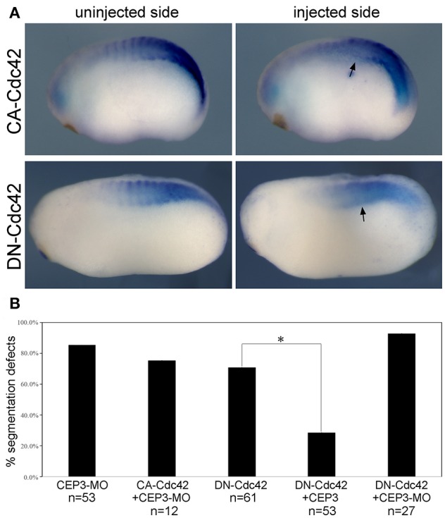 Figure 4. Cdc42 needs to be tightly controlled during somite segmentation. (A) 0.05 ng of constitutively active (CA) or dominant negative (DN) Cdc42 was injected into one side of the embryo, and their effect on somite segmentation was examined by the expression of myod1. Comparing to the uninjected control side, the segmented expression pattern of myod1 was lost on the injected side (arrows), suggesting that both increased and decreased activity of Cdc42 will affect somite segmentation. (B) CA-Cdc42 was co-injected with CEP3-MO, and CEP3 or CEP3-MO was co-injected with DN-Cdc42 to determine whether they can rescue segmentation defects caused by CEP3 or Cdc42 knockdown. The percentage of embryos with segmentation defect was summarized in the bar graph. chi-2 test indicates that CA-Cdc42 failed to rescue segmentation defects caused by CEP3-MO (p = 0.52), but CEP3 significantly rescued segmentation defects caused by DN-Cdc42 (*p < 0.01). Coinjection of CEP3-MO with DN-Cdc42, on the other hand, further inhibited somite segmentation (p = 0.02 when comparing with DN-Cdc42 alone).