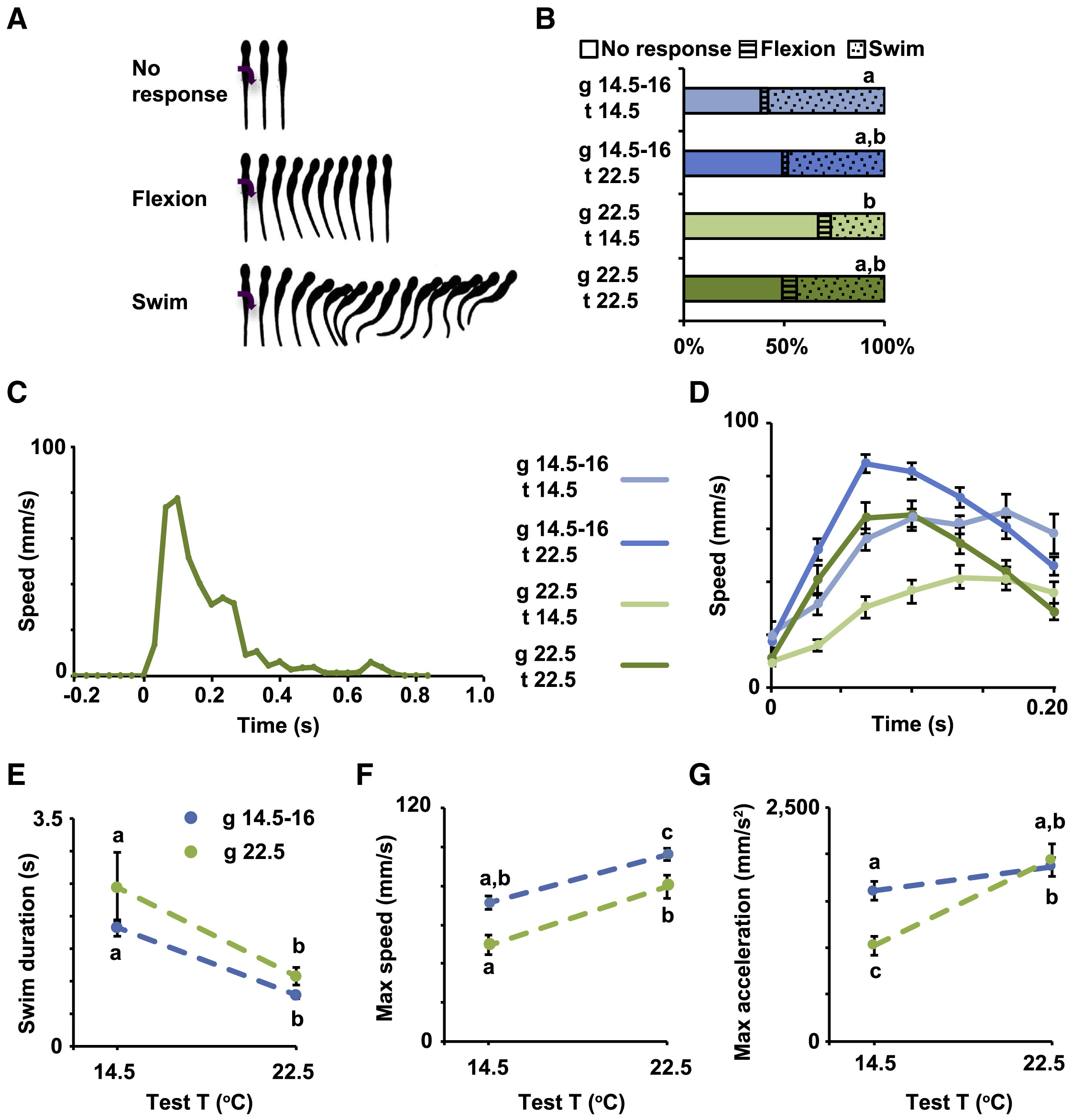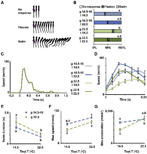 Figure 1. The Temperature of the Environment during Development Influences Early Swimming Behavior in Xenopus laevis Larvae (A) Types of behavioral responses to gentle touch; modified from [26, 27]. (BâG) Stage 37/38 (B) and 40 (C-G) larvae grown in cold (blue, 14.5°Câ16°C) or warm (green, 22.5°C) temperature were subjected to 20 trials each of gentle touch at cold (14.5°C) or warm (22.5°C) temperature. Responses were video recorded at 30 Hz, n = 6 larvae per condition. (B) Average percentage of incidence of each response. (C) Example of full time course of swim speed after gentle touch (0 s) from stage 40 larva grown in and tested at warm temperature. (D) Time course of changes in speed during initial phase (first 200 ms) of the swim response. (E) Swim duration. (F) Maximum speed during initial phase of the swim response. (G) Maximum tangential acceleration during initial phase of the swim response. In (D)â(G), data are mean ± SEM. In (B) and (E)â(G), the letters on top of datasets indicate significant (different letters) or not significant (same letters) differences, p < 0.05, 2-way ANOVA, Tukey post hoc test. |