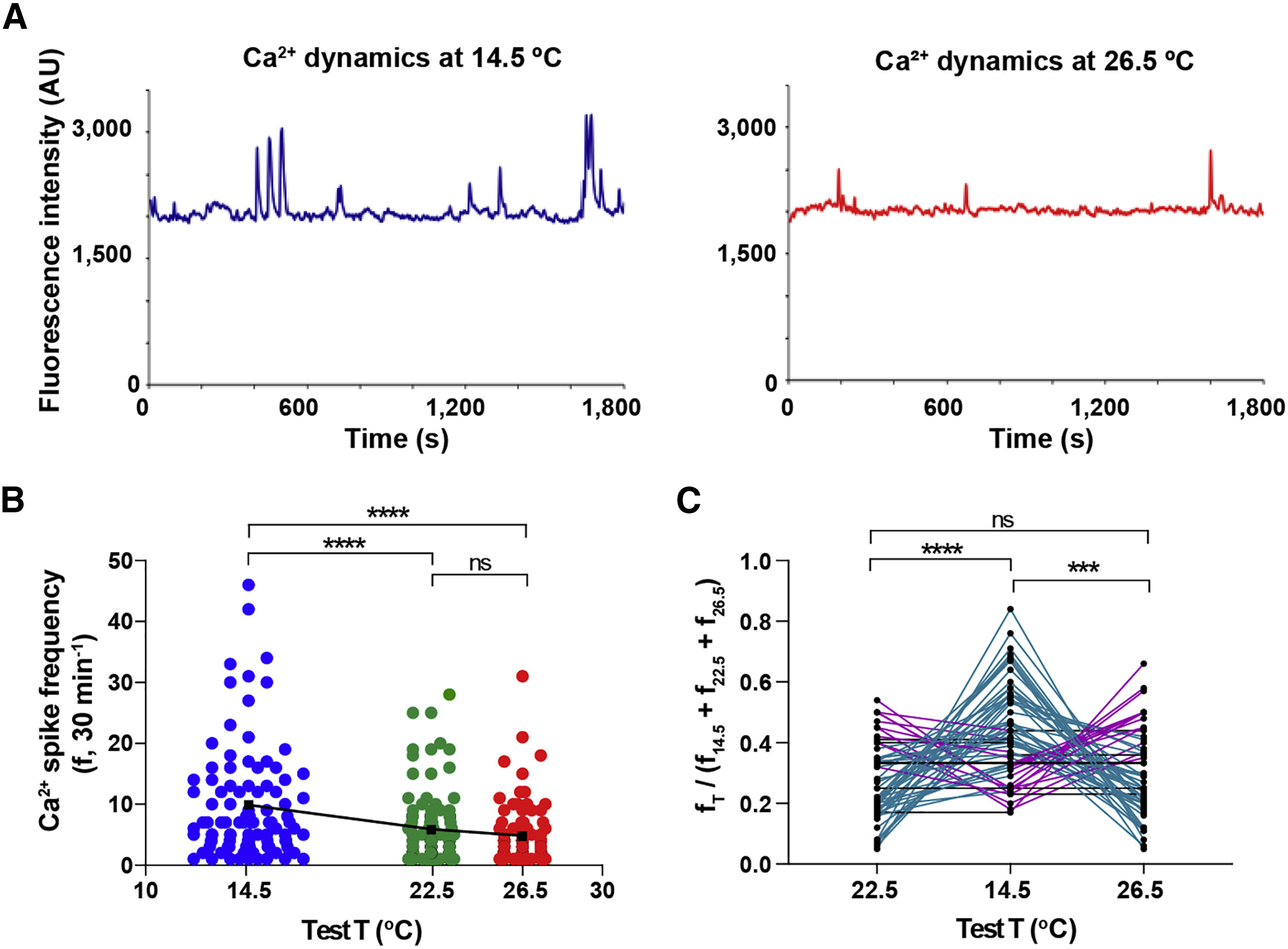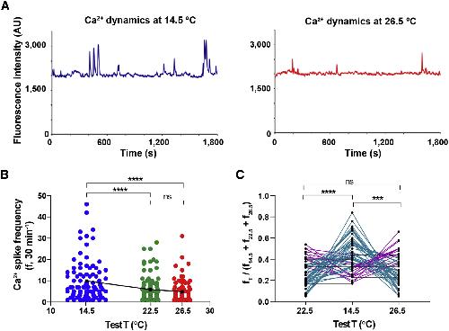 Figure 3. Cold Temperature Acutely Increases Ca2+ Spike Frequency of Embryonic Ventral Spinal Neurons Ventral view of spinal cords from stage 24 embryos were Ca2+ imaged for 30-min intervals at 14.5°C, 22.5°C, and 26.5°C ± 0.5°C, in a randomized order. (A) Traces illustrate the same representative ventral spinal neuron imaged at the indicated temperatures. (B) Graph shows individual cell and mean (black squares) Ca2+ spike frequency (30 min-1) from N = 4 ventral spinal cords (n of neurons analyzed: 14.5°C, 102; 22.5°C, 104; 26.5°C, 86), ââââp < 0.0001; ns, not significant; repeated-measures mixed effect analysis; post hoc Tukey test. (C) Graph shows ratio of Ca2+ spikes at each temperature compared to the sum of spikes at the 3 temperatures per cell, n = 58. Teal lines represent neurons with higher spike frequency at 14.5°C, magenta lines represent neurons with higher spike frequency at 22.5°C or 26.5°C, and black lines represent neurons with no change in spike frequency across temperatures; âââp < 0.001, ââââp < 0.0001; ns, not significant; repeated-measures 2-way ANOVA, post hoc Tukey test. |