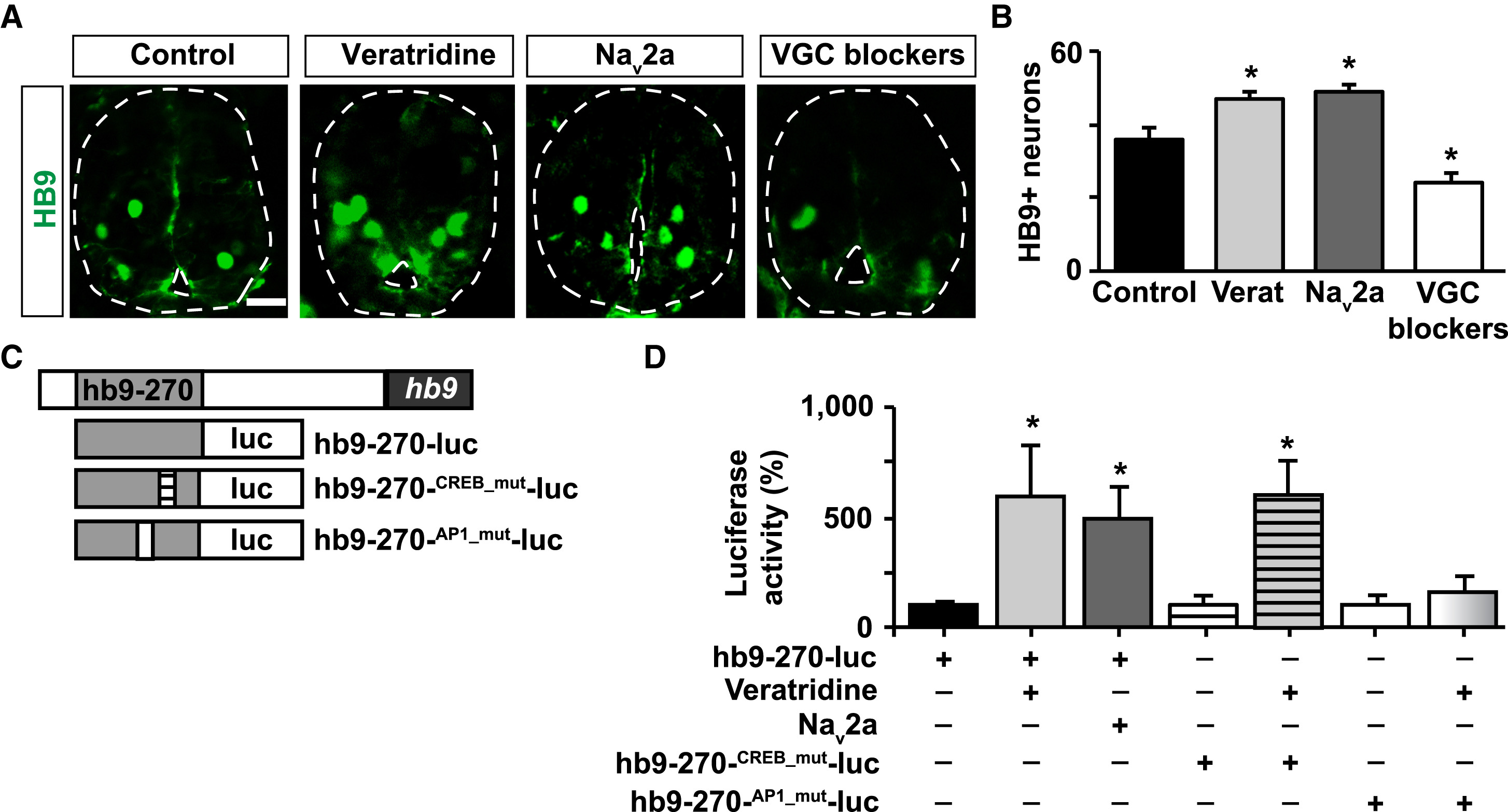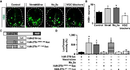 Figure 5. Electrical Activity Regulates the Number of Motor Neurons in the Spinal Cord and hb9 Transcription (A) Images show cross-sections of immunostained spinal cord (outlined) from stage 35 larvae in which activity was enhanced (veratridine [verat], Nav2a overexpression) or suppressed (voltage-gated Na+ and Ca2+ channel blockers [VGC blockers]: calcicludine, Ï-conotoxin-GVIA, flunarizine, and tetrodotoxin). Scale bar, 20 μm (B) Graph shows number of HB9-immunopositive cells per 100 μm spinal cord; mean ± SEM from at least 220 μm length of spinal cord per larva, n ⥠4 larvae per condition, âp < 0.05, 1-way ANOVA. (C) Schematic of luciferase reporters used to assess regulation of hb9 transcription. Gray box represents a 270-bp fragment from the M250/Region B in the hb9 5â² regulatory region. (D) Spinal cord from wild-type or Nav2a-overexpressing embryos injected with wild-type or mutant forms of the hb9 transcription reporter were incubated for 8 h with 1 μM veratridine or vehicle only and processed for luciferase activity measurements. Graph shows percentage of normalized luciferase intensity compared with control (wild-type embryo incubated with vehicle only), mean ± SEM, n > 5 spinal cords per group, âp < 0.05, 1-way ANOVA. |