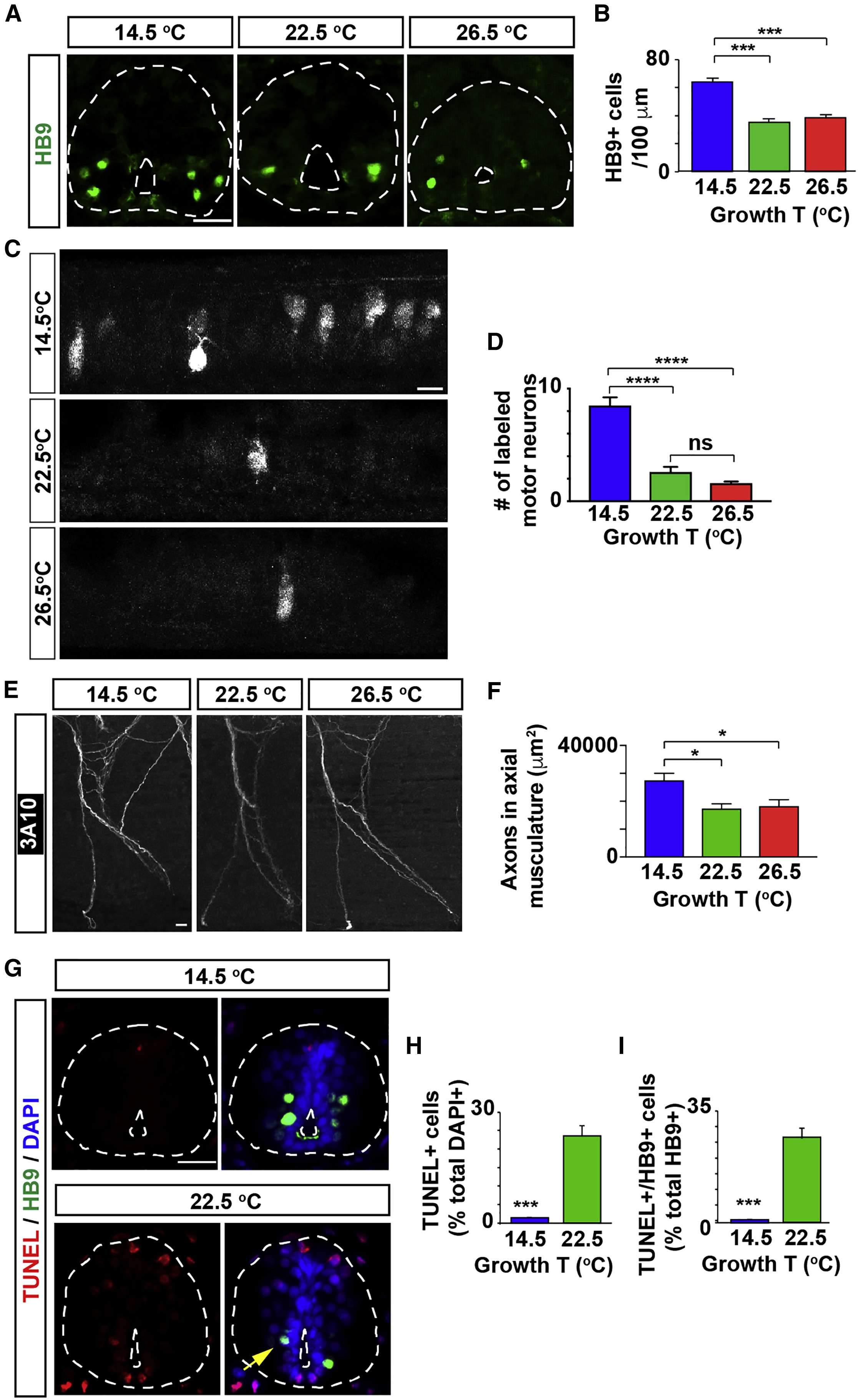 Figure 2. The Number of Spinal Motor Neurons in Developing Larvae Is Temperature Dependent (A) Images show cross-sections of immunostained spinal cord (outlined) from stage 40 larvae grown in cold (14.5°C) or warm (22.5 or 26.5°C) temperatures. (B) Graph shows number of HB9-immunopositive cells per 100 μm of spinal cord; mean ± SEM from at least 220 μm length of spinal cord per larva, n ⥠4 larvae per condition, âââp < 0.001, 1-way ANOVA, Tukey post hoc test. (C) Images show maximum intensity projections of whole-mount spinal cord from stage 40 larvae grown in different temperatures followed by retrograde labeling with Alexa 488-dextran conjugate from ventral axial musculature. (D) Graph shows numbers of retrogradely labeled motor neurons; mean ± SEM for each experimental group, n ⥠10 larvae per condition, ââââp < 0.0001; ns, not significantâ Kruskal-Wallis testâ Dunnâs multiple comparisons test. (E) Images show maximum intensity projections of whole-mount immunostained axonal bundle #5 (with 1 being the most anterior axonal bundle innervating the axial musculature) with the axonal marker 3A10 (neurofilament associated protein), from stage 40 larvae grown in the indicated temperatures. (F) Graph shows area labeled per axonal bundles 4 through 7; mean ± SEM for each experimental group, n ⥠10 larvae per condition, âp < 0.05, 1-way ANOVA, post hoc Tukey test. (GâI) Larvae grown in cold temperature exhibit fewer apoptotic spinal cord cells and motor neurons. (G) Images show cross-sections of immunostained spinal cord (outlined) from stage 40 larvae grown in different temperatures. Scale bars in (A), (C), (E), and (G), 20 μm. (H and I) Graphs show percentage of TUNEL+ (H, per total DAPI-labeled nuclei) and HB9+/TUNEL+ cells (I, per total HB9+ cells) per 100 μm of spinal cord; mean ± SEM from at least 220 μm length of spinal cord per larva, n ⥠4 larvae per condition, âââp < 0.001, two-tailed t test. |