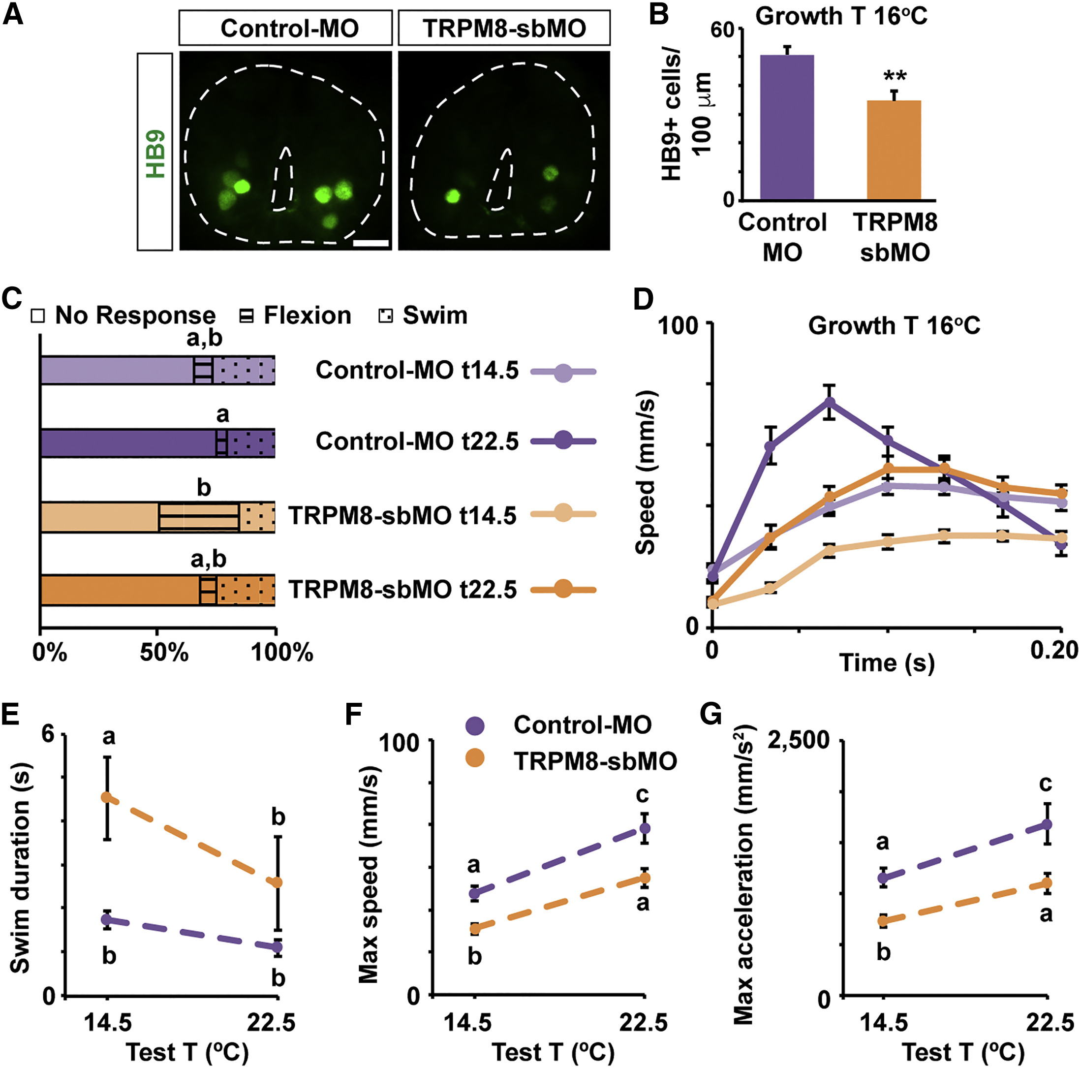 Figure 6. TRPM8 Is Necessary for the Increase in Motor Neuron Number and the Adaptation of the Sensorimotor Response of Animals Grown in Cold Temperatures (A) Images show cross-sections of immunostained spinal cord (outlined) for HB9 from Control-MO- or TRPM8-sbMO-containing stage 40 larvae grown in cold temperature (16°C). Scale bar, 20 μm. (B) Graph shows number of HB9-immunopositive cells per 100 μm of spinal cord; mean ± SEM from at least 220 μm-length spinal cord per larva, n = 5 larvae per condition, ââp < 0.005, two-tailed t test. (CâG) TRPM8-sbMO or Control-MO stage 37/38 (C) and 40 (DâG) larvae grown in cold temperature (16°C) were subjected to 20 trials each of gentle touch at cold (14.5°C) or warm (22.5°C) temperature. Responses were video recorded at 30 Hz, n = 6 larvae per condition. (C) Average percentage of incidence of each response. (D) Time course of changes in speed during initial phase (first 200 ms) of the swim response. (E) Swim duration. (F) Maximum speed during initial phase of the swim response. (G) Maximum tangential acceleration during initial phase of the swim response. In (D)â(G), data are mean ± SEM. In (C) and (E)â(G), the letters on top of datasets indicate significant (different letters) or not significant (same letters) differences, p < 0.05, 2-way ANOVA, Tukey post hoc test. |