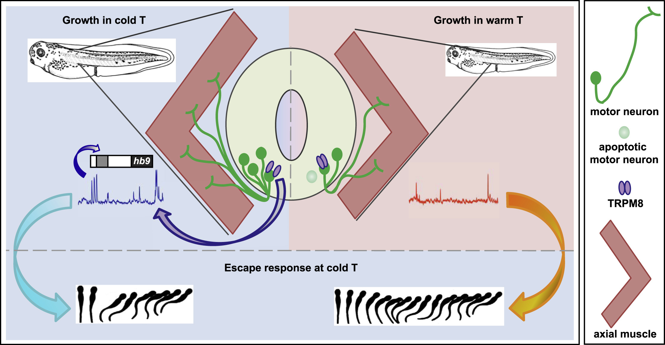 Figure 7. Model of Mechanism of Cold-Temperature Adaptation TRPM8 activation at cold temperature results in an increase in Ca2+ spike frequency in developing spinal cord neurons. This enhanced spike frequency increases HB9-dependent motor neuron differentiation and survival. The low-temperature mediated increase in motor neuron number facilitates faster escape swimming at cold temperature compared to animals grown in warm temperature, for efficiently evading predators and increasing rate of survivability. |
