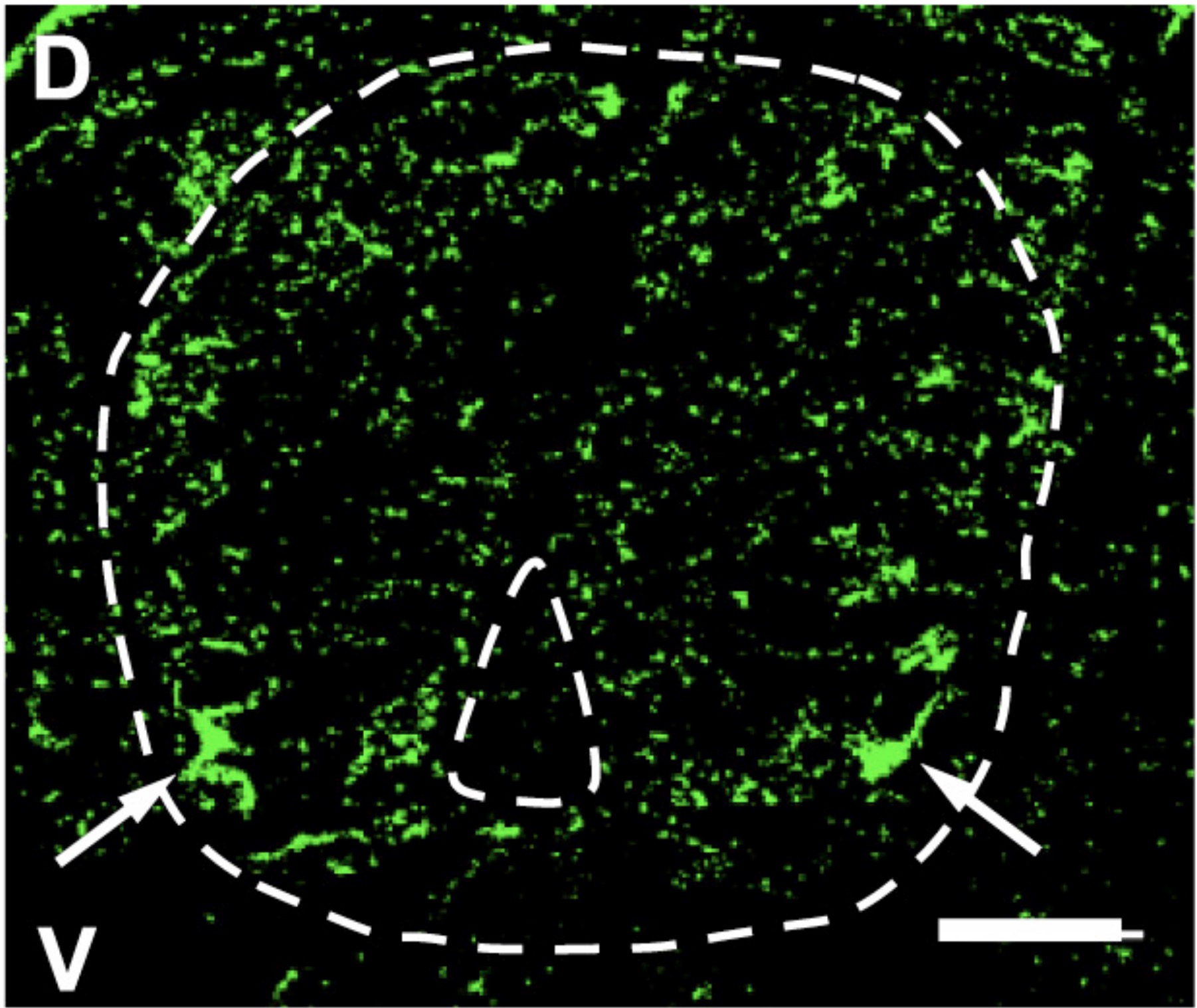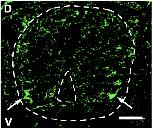 Immunostained transverse section of NF stage 25 Xenopus spinal cord (outlined) using Trpm8 Ab1 (Alomone Labs Cat# ACC-049, RRID:AB_2040254). D, dorsal; V, ventral; scale bar, 20 μm. Arrows indicate TRPM8 clusters in ventral neuron domains. |