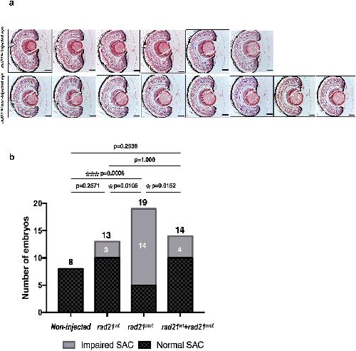 Fig. 5. Thinner SAC in rad21mut injected eyes. a. Consecutive sections showing the difference in SAC thickness between the injected and non-injected side of an embryo in the rad21mut group. Each image represents histology section of 5 μm thickness. For this embryo, the SAC is around 10 μm thinner in the rad21mut injected side compared with the non-injected side. Scale bar: 50 μm. b. The number of embryos with normal SAC and impaired SAC in each group. Numbers of embryo in each group are listed above the bars. Numbers of embryo showing impaired SAC are shown within the bars. Statistics is done by using Fisher's exact test. * indicates statistical significance of p < 0.05. *** indicates statistical significance of p < 0.01.