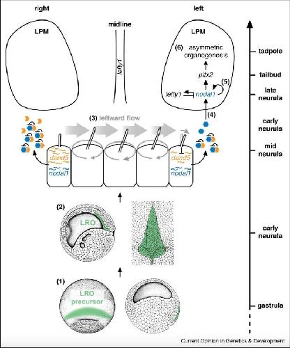 (1) Foxj1 expression (green) in the early gastrulaembryo marks the LRO precursor (superficial mesoderm), from which (2) the LRO derives when the SM involutes to line the roof of the primitive gut. (3) Central LRO cells harbor motile cilia which polarize to the posterior cell poles and rotate in a clockwise manner to generate a leftward flow of extracellular fluids. LateralLRO cells possess immotile cilia and co-express nodal1 (blue) and the Nodal inhibitor dand5 (orange). Flow sensing at the leftLRO margin results in dand5 down-regulation, which allows Nodal to signal and (4) transfer to the LPM. In the leftLPM, (5) Nodal signaling induces the three target genes of the nodal cascade, nodal1 itself, the feedback inhibitor lefty1 and the homeobox transcription factor pitx2. Spreading of left-asymmetric signaling is prevented by lefty1 expression at the midline (notochord and floor plate). (6) The Nodal cascade in due course drives asymmetric organ morphogenesis.