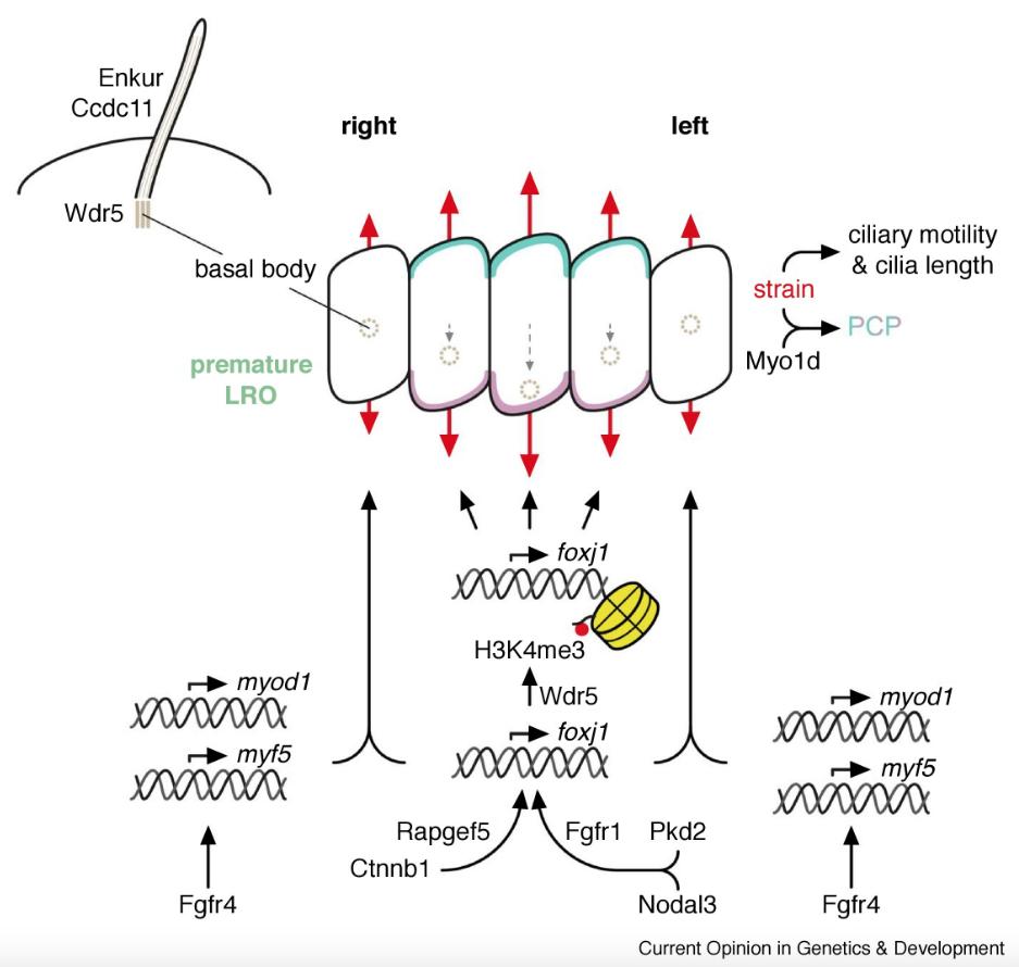 Induction of foxj1 in central LRO precursor cells requires canonical Wnt signaling as well as signaling through Fgfr1. The latter is activated by the unconventional FGF ligand Nodal3, synergizing with Polycystin-2, whereas the former requires rapgef5, which presumably regulates nuclear import of Ã-catenin (Ctnnb1). Lateral flow-sensing LRO cells depend on FGF signaling through receptor 4, which activates myf5 and myod1 in these cells that are fated to integrate into the somites. Accessibility of the foxj1 promoter is regulated by methylation of histone H3 (H3K4me3); for assembly of the methyltransferase enzyme complex, Wdr5 constitutes a central scaffolding component. Mechanical strain (red arrows) exerted on the involuting LRO precursor causes PCP-dependent posterior polarization of LROcilia, which become motile in a strain-dependent and foxj1-dependent manner. The foxj1 gradient of gene expression (cf. Figure 1) is reflected by a medial-lateral gradient of cilia lengths and polarization. PCP is acted upon as well by the unconventional myosin Myo1d. Novel ciliary factors acting on cilia include Wdr5 (at the ciliary base) and Ccdc11 as well as Enkur (in the ciliary axoneme). These factors await detailed functional characterization.