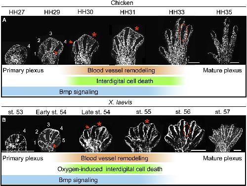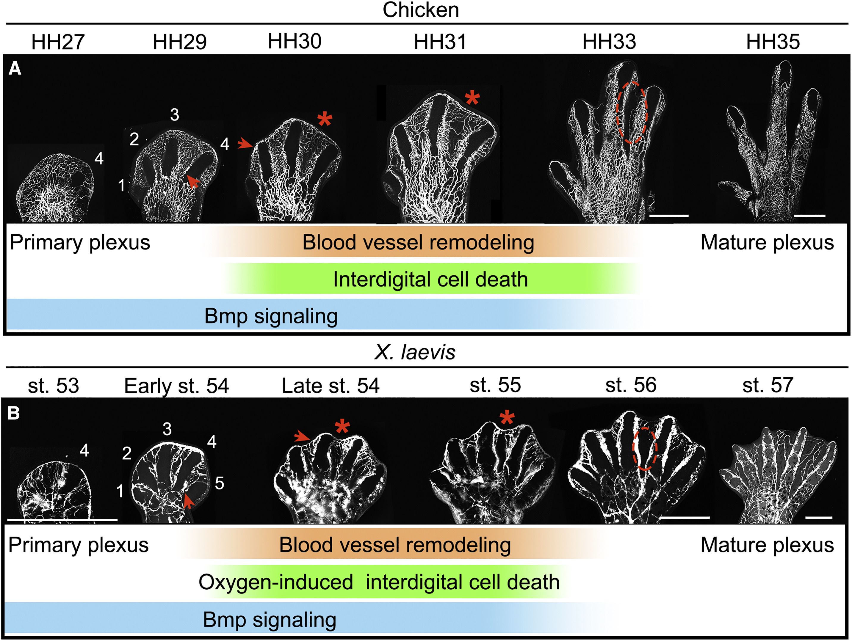 (A and B) Vasculature (fluorescent ink injection) of chicken hindlimbs (HH27, n = 4; HH29, n = 3; HH30, n = 9; HH31, n = 8; HH32, n = 4; HH33, n = 4; HH35, n = 3) and X. laevis hindlimbs (stage 53, n = 6; early stage 54, n = 5; late stage 54, n = 3; stage 55, n = 3; stage 56, n = 4; stage 57, n = 5). Vascular remodeling induced by the newly formed finger cartilages is observed firstly in the perichondral region (red arrows) and then in the interdigital region (red asterisk) of both species. During remodeling stages, interdigital cell death is observed or can be experimentally induced in chicken and X. laevis, respectively; interdigital Bmp signaling is also still active (Figures S1A and S1B). At a later stage, regression of the vasculature is observed (red lines).