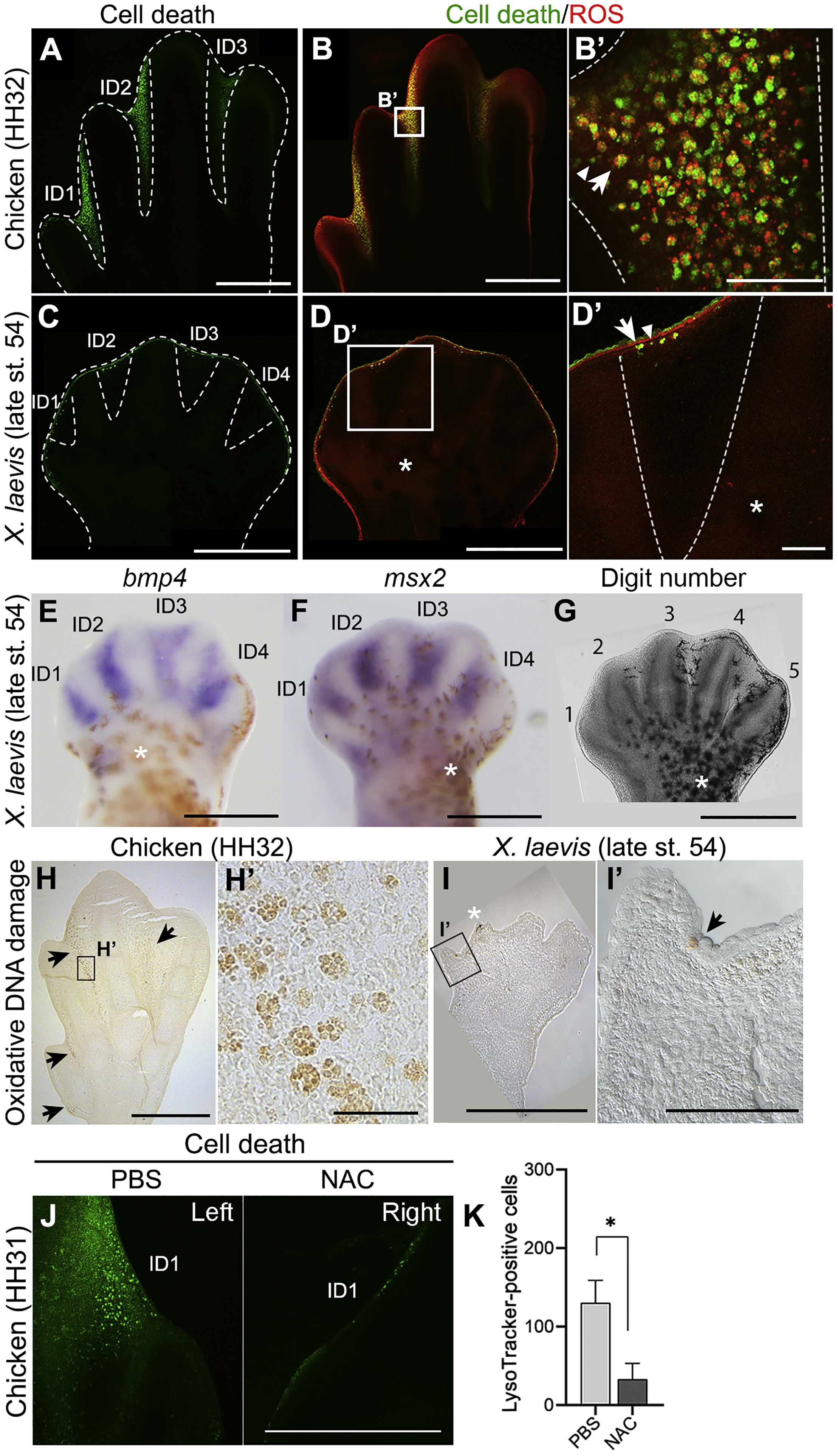 (J) Cell death (LysoTracker green) in stage HH31 chicken forelimbs incubated for 6 h with the ROS scavenger N-acetyl-cysteine (NAC, right limbs; PBS, left limbs; n = 5).