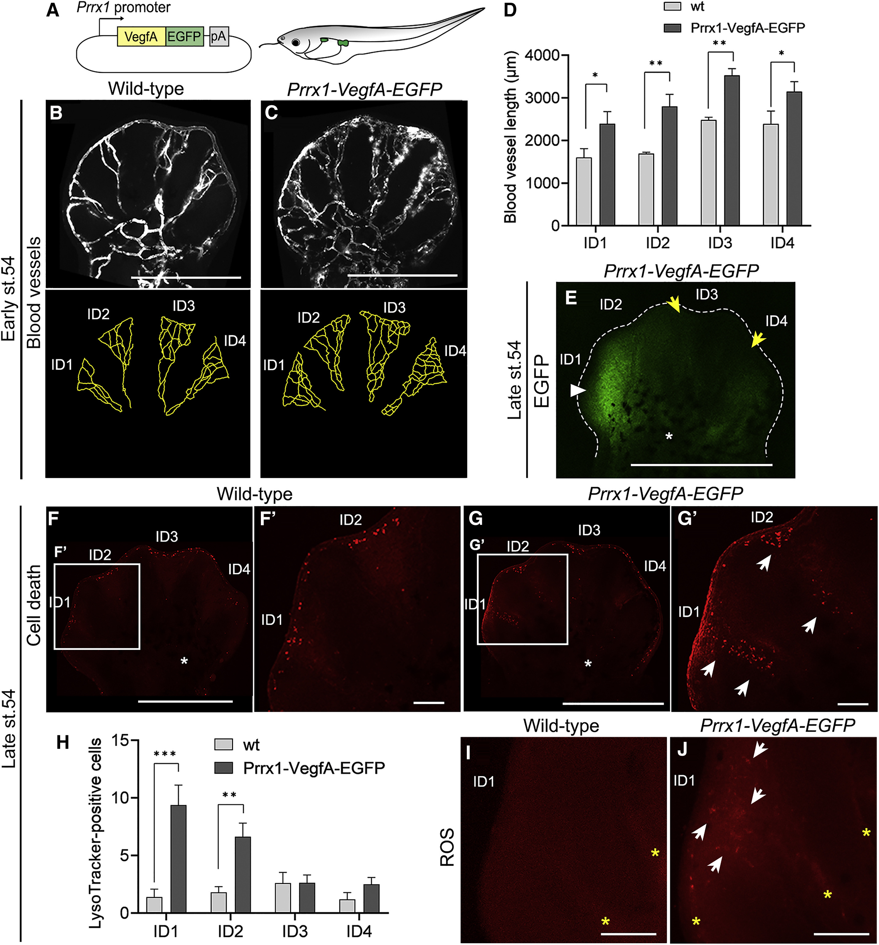 (I and J) ROS staining (CellROX Deep Red) of late stage 54 wild-type (n = 6) and Prrx1-VegfA-EGFP (n = 4) hindlimbs. Ectopic ROS production (white arrows) is detected in cells in the anterior region in transgenic limbs. Yellow asterisks, fixation artifact.